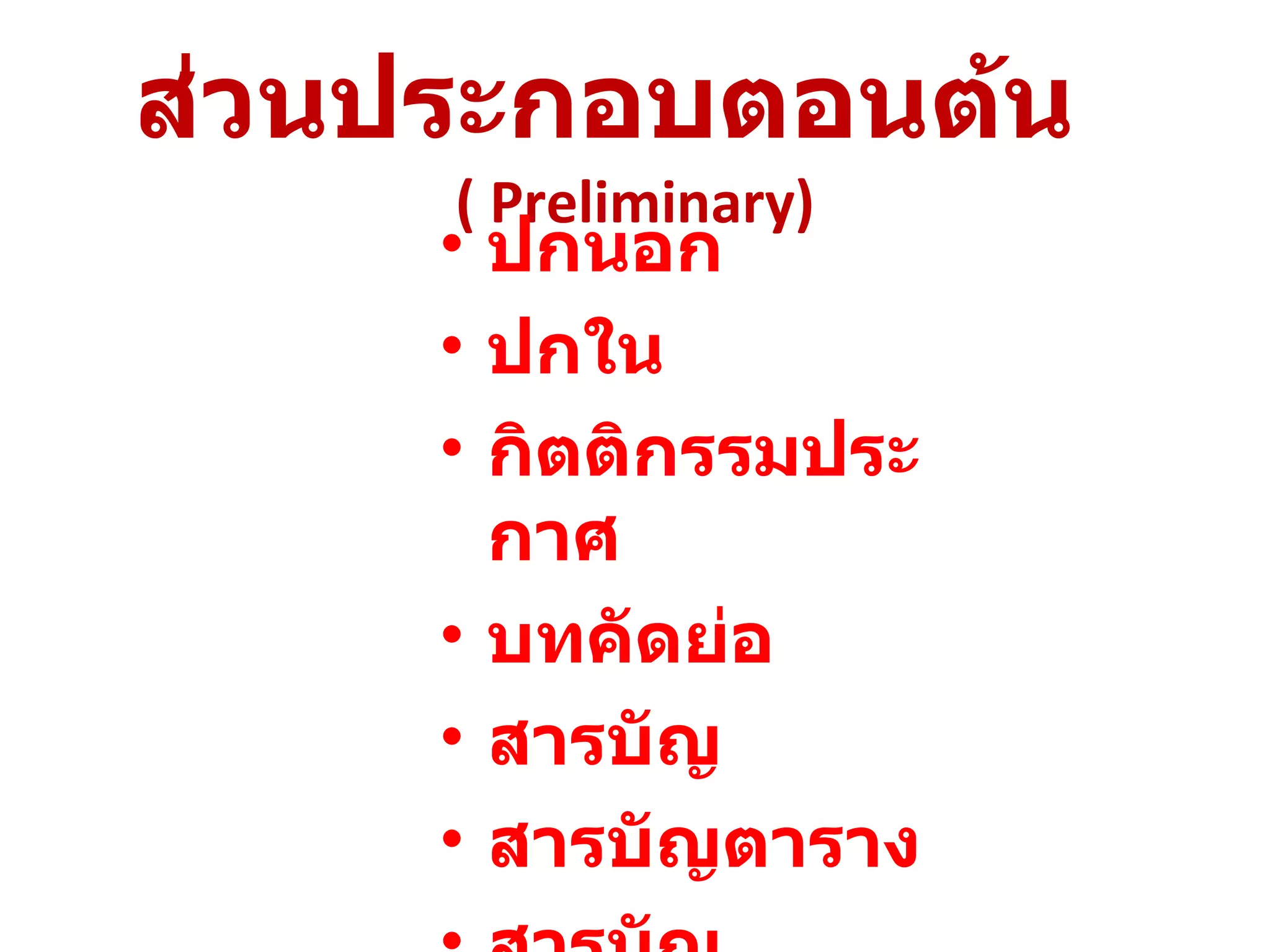 ส่วนประกอบตอนต้น ( Preliminary ) ปกนอก ปกใน กิตติกรรมประกาศ บทคัดย่อ สารบัญ สารบัญตาราง สารบัญแผนภูมิ - 3.