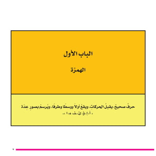تناقش الوثيقة موضوع الهمزة في اللغة العربية، بدءًا من تعريفها وأنواعها (القطعة والوصل) وأماكن استخدامها في الكلمات. تركز أيضًا على القواعد المتعلقة بـ حركة الهمزة في بداية الكلمة ووسطها، بالإضافة إلى بعض الأمثلة. تقدم الوثيقة إرشادات حول كيفية الكتابة الصحيحة للكلمات التي تحتوي على همزة.