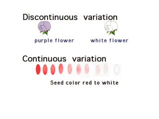 พันธุกรรม 1. กรรมพันธุ์ พันธุกรรม พันธุศาสตร์ ลักษณะทางพันธุกรรม : ลักษณะเฉพาะที่ถ่ายทอดจากรุ่นหนึ่งไปยัง อีกรุ่นหนึ่งต่อๆไป - สิ่งมีชีวิตแต่ละชนิด , แต่ละ species จะมีลักษณะรูปร่าง และโครงสร้าง เฉพาะตัวที่แตกต่างจากสิ่งมีชีวิตชนิดอื่น - สิ่งมีชีวิตชนิดเดียวกัน , species เดียวกันมีลักษณะแตกต่างกัน น้อยกว่า สิ่งมีชีวิตต่างชนิด การถ่ายทอดลักษณะทางพันธุกรรม 2. 3. 4. ความแปรผันทางพันธุกรรม ( Genetic variation ) 1. ความแปรผันต่อเนื่อง ( Continuous variation ) มีลักษณะดังนี้ - ไม่สามารถแยกความแตกต่างได้เด่นชัด - ความแตกต่างของลักษณะจะปรากฏเป็นลำดับต่อเนื่องกัน - ถูกควบคุมโดย gene หลายคู่ - สิ่งแวดล้อมมีอิทธิพลต่อการแสดงออก - มีความเกี่ยวข้องทางด้านปริมาณ - กราฟแสดงความถี่ของลักษณะที่แตกต่างเป็นรูปโค้งปกติ - ตัวอย่าง ความสูง น้ำหนัก สติปัญญา ความสามารถในการ ให้ ผลผลิต 5. 6. 7. 2. ความแปรผันไม่ต่อเนื่อง ( Discontinuous variation ) มีลักษณะดังนี้ - มีความแตกต่างชัดเจน - ถูกควบคุมโดย gene น้อยคู่ - สิ่งแวดล้อมมีผลต่อการแสดงออกน้อยมาก - มีความเกี่ยวข้องทางด้านคุณภาพ - กราฟความถี่ของลักษณะที่แตกต่าง จะได้กราฟรูปแท่ง - ตัวอย่าง หมู่เลือด ลักยิ้ม ติ่งหู การห่อลิ้น 8. 9. 10. คำศัพท์ที่ควรรู้ 1. Gamete 2. Gene 3. Allele P P homozygous for the dominant allele a a homozygous for the recessive allele B b heterozygous recessive allele , dominant allele 11. 4. Genotype การเขียน TT , Tt , tt หรือ T/T , T/t , t/t Genotype มี 2 แบบ คือ - homozygous genotype – homozygous dominant - homozygous recessive - heterozygous genotype 5. Phenotype 6. Dominant 7. Recessive 12. ลักษณะทางพันธุกรรมกับสิ่งแวดล้อม สิ่งแวดล้อมมีอิทธิพลต่อลักษณะทางพันธุกรรมมาก – น้อยขึ้น กับขั้นตอนที่ทำให้เกิดลักษณะนั้นๆ เช่น - ถ้าลักษณะทางพันธุกรรมนั้นเกี่ยวข้องกับปัจจัยหลายอย่าง ลักษณะนั้นมโอกาสได้รับอิทธิพลจากสิ่งแวดล้อมมาก เช่น ความสูง สติปัญญาปริมาณการให้น้ำนมของโค - ถ้าลักษณะทางพันธุกรรมนั้นเป็นลักษณะที่เกิดจากปฏิกิริยาภายในเซลล์ความผิดปกติภายในเซลล์ สิ่งแวดล้อมจะมีอิทธิพลน้อย เช่นลักษณะผิวเผือก ตาบอดสี หมู่เลือด 13. 14. Unit factor เมนเดลพบว่า ลักษณะต่างๆของถั่วลันเตาถูกควบคุมโดยพันธุกรรม 2 หน่วย ธรรมชาติของต้นถั่วลันเตา 1. อายุสั้น ปลูกง่าย ผลดก เมล็ดมาก 2. มีลักษณะแตกต่างกันอย่างชัดเจน 3. โครงสร้างดอกไม่เปิดโอกาสให้มีการผสมข้ามต้น ความสำเร็จของเมนเดล 1. ลักษณะที่เมนเดลศึกษาถูกควบคุมโดย gene 1 คู่ 2. ลักษณะที่เมนเดลศึกษาจะแตกต่างกันอย่างชัดเจน 3. ใช้พืชที่หาได้ง่าย 4. ใช้พ่อ – แม่พันธุ์เป็นพันธุ์แท้ 5. เป็นนักคณิตศาสตร์ 15. 16. ลักษณะที่ ทดลอง รุ่นพ่อ - แม่ ลักษณะของ รุ่น F 1 ลักษณะของ รุ่น F 2 อัตราส่วนของ ลักษณะทั้งสอง ในรุ่น F2 ความสูงลำต้น สูง เตี้ย สูงหมด สูง 787 เตี้ย 2.84 : 1 ร