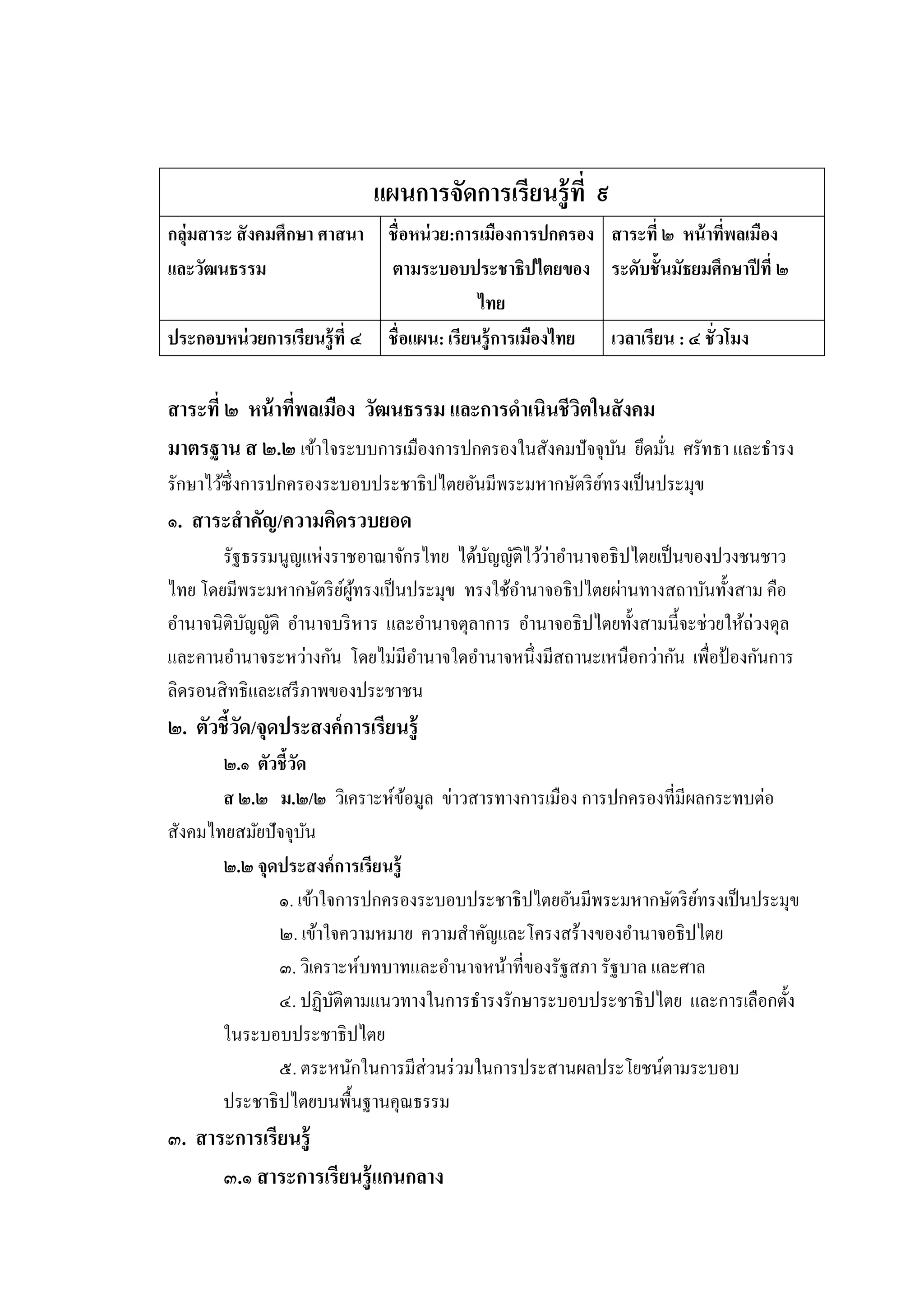 สั งคมศึกษา ศาสนา ชื่อหน่ วย:การเมืองการปกครอง สาระที่ ๒ หน้ าทีพลเมือง ่ และวัฒนธรรม ตามระบอบประชาธิปไตยของ ระดับชั้นมัธยมศึกษาปี ที่ ๒ ไทย ประกอบหน่ วยการเรียนรู้ ที่ ๔ ชื่อแผน: เรียนรู้ การเมืองไทย เวลาเรียน : ๔ ชั่วโมง สาระที่ ๒ หน้ าทีพลเมือง วัฒนธรรม และการดาเนินชีวตในสั งคม ่ ิ มาตรฐาน ส ๒.๒ เข้าใจระบบการเมืองการปกครองในสังคมปัจจุบน ยึดมัน ศรัทธา และธารง ั ่ รักษาไว้ซ่ ึงการปกครองระบอบประชาธิปไตยอันมีพระมหากษัตริ ยทรงเป็ นประมุข ์ ๑. สาระสาคัญ/ความคิดรวบยอด ่ รัฐธรรมนูญแห่งราชอาณาจักรไทย ได้บญญัติไว้วาอานาจอธิ ปไตยเป็ นของปวงชนชาว ั ไทย โดยมีพระมหากษัตริ ยผทรงเป็ นประมุข ทรงใช้อานาจอธิ ปไตยผ่านทางสถาบันทั้งสาม คือ ์ ู้ อานาจนิติบญญัติ อานาจบริ หาร และอานาจตุลาการ อานาจอธิ ปไตยทั้งสามนี้จะช่วยให้ถ่วงดุล ั และคานอานาจระหว่างกัน โดยไม่มีอานาจใดอานาจหนึ่งมีสถานะเหนือกว่ากัน เพื่อป้ องกันการ ลิดรอนสิ ทธิและเสรี ภาพของประชาชน ๒. ตัวชี้วด/จุดประสงค์ การเรียนรู้ ั ๒.๑ ตัวชี้วด ั ส ๒.๒ ม.๒/๒ วิเคราะห์ขอมูล ข่าวสารทางการเมือง การปกครองที่มีผลกระทบต่อ ้ สังคมไทยสมัยปัจจุบน ั ๒.๒ จุดประสงค์ การเรียนรู้ ๑. เข้าใจการปกครองระบอบประชาธิปไตยอันมีพระมหากษัตริ ยทรงเป็ นประมุข ์ ๒. เข้าใจความหมาย ความสาคัญและโครงสร้างของอานาจอธิปไตย ๓. วิเคราะห์บทบาทและอานาจหน้าที่ของรัฐสภา รัฐบาล และศาล ๔. ปฏิบติตามแนวทางในการธารงรักษาระบอบประชาธิ ปไตย และการเลือกตั้ง ั ในระบอบประชาธิปไตย ๕. ตระหนักในการมีส่วนร่ วมในการประสานผลประโยชน์ตามระบอบ ประชาธิ ปไตยบนพื้นฐานคุณธรรม ๓. สาระการเรียนรู้ ๓.๑ สาระการเรียนรู้ แกนกลาง
