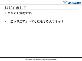 株式会社アクシスウェア( http://www.axisware.co.jp ) ソフトウェアデザイン事業部 チーフアーキテクト アーキテクトとして全体最適や標準化を行う 連絡先 [email_address] mixi :てらひで!!( ID : 3315992 )