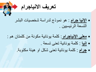 الجرام الشخصيات نموذج لدراسة تسعة شخصيات رئيسية. الوثيقة تتناول صفات هذه الشخصيات وعلاقتها ببعضها وتأثيرها على التصرفات الإنسانية. يتضمن الموضوع تفاصيل عن المراكز العاطفية والتفكيرية والغرائزية لكل شخصية.