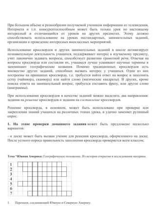 Документ рассматривает использование нестандартных и занимательных заданий, таких как кроссворды, для активизации познавательной деятельности учащихся на уроках географии. Он описывает различные типы заданий, которые помогают развивать грамотность, умение ориентироваться по картам и запоминать географические термины. Также упоминаются методы подготовки и проведения игровых уроков и внеклассных мероприятий для стимуляции интереса к предмету.