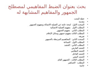 📖 الضبط المفاهيمي لمصطلح الجمهور 🧠 الفرق بين الجمهور والمفاهيم المشابهة 🗣️ الجمهور مقابل المتلقي 👥 الجمهور مقابل الرأي العام 📰 الجمهور والإعلام 🧩 أنواع الجمهور (عام – خاص – افتراضي...)