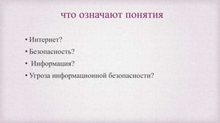 Документ освещает важные аспекты безопасности в интернете, включая определение ключевых понятий, таких как интернет и информационная безопасность. Он описывает угрозы, с которыми могут столкнуться дети в онлайн-пространстве, и дает рекомендации для родителей по защите детей от киберпреступности и нежелательной информации. Также документ подчеркивает важность соблюдения законов и этикета в интернете.