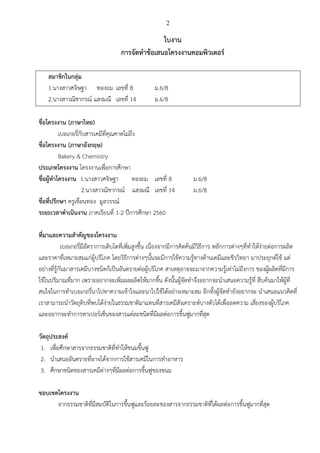 8 ม.6/8 2.นางสาวณิชากรณ์ แสงมณี เลขที่ 14 ม.6/8 ชื่อโครงงาน (ภาษาไทย) เบอเกอรี่กับสารเคมีที่คุณคาดไม่ถึง ชื่อโครงงาน (ภาษาอังกฤษ) Bakery & Chemistry ประเภทโครงงาน โครงงานเพื่อการศึกษา ชื่อผู้ทาโครงงาน 1.นางสาวศจิษฐา ทองถม เลขที่ 8 ม.6/8 2.นางสาวณิชากรณ์ แสงมณี เลขที่ 14 ม.6/8 ชื่อที่ปรึกษา ครูเขื่อนทอง มูลวรรณ์ ระยะเวลาดาเนินงาน ภาคเรียนที่ 1-2 ปีการศึกษา 2560 ที่มาและความสาคัญของโครงงาน เบอเกอรี่มีอัตราการเติบโตที่เพิ่มสูงขึ้น เนื่องจากมีการคิดค้นมีวิธีการ หลักการต่างๆที่ทาให้ง่ายต่อการผลิต และราคาที่เหมาะสมแก่ผู้บริโภค โดยวิธีการต่างๆนั้นจะมีการใช้ความรู้ทางด้านเคมีและชีววิทยา มาประยุกต์ใช้ แต่ อย่างที่รู้กันมาสารเคมีบางชนิดก็เป็นอันตรายต่อผู้บริโภค สาเหตุอาจจะมาจากความรู้เท่าไม่ถึงการ ของผู้ผลิตที่มีการ ใช้ในปริมาณที่มาก เพราะอยากจะเพิ่มผลผลิตให้มากขึ้น ดังนั้นผู้จัดทาจึงอยากจะนาเสนอความรู้ที่ สืบค้นมาให้ผู้ที่ สนใจในการทาเบอเกอรี่นาไปทาความเข้าใจและนาไปใช้ได้อย่างเหมาะสม อีกทั้งผู้จัดทายังอยากจะ นาเสนอแนวคิดที่ เราสามารถนาวัตถุดิบที่พบได้ง่ายในธรรมชาติมาแทนที่สารเคมีสังเคราะห์บางตัวได้เพื่อลดความ เสี่ยงของผู้บริโภค และอยากจะทาการหาเปอร์เซ็นของสารแต่ละชนิดที่มีผลต่อการขึ้นฟูมากที่สุด วัตถุประสงค์ 1. เพื่อศึกษาสารจากธรรมชาติที่ทาให้ขนมขึ้นฟู 2. นาเสนออันตรายที่อาจได้จากการใช้สารเคมีในการทาอาหาร 3. ศึกษาชนิดของสารเคมีต่างๆที่มีผลต่อการขึ้นฟูของขนม ขอบเขตโครงงาน จากธรรมชาติที่มีสมบัติในการขึ้นฟูและร้อยละของสารจากธรรมชาติที่ได้ผลต่อการขึ้นฟูมากที่สุด
