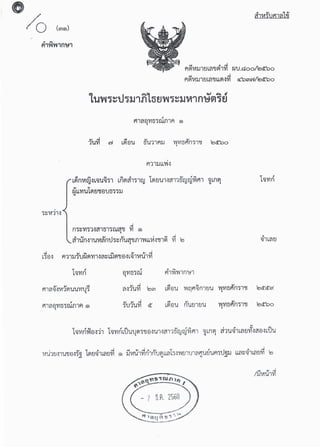 แพ้คดีในชั้นอุทธรณ์ 17 ม.ค.61 วันนี้ไปศาลนนทบุรี ฟังคำพิพากษาศาลอุทธรณ์ คดีคนไข้ฟ้องกระทรวงสาธารณสุข ในฐานะต้นสังกัดรพ.นครปฐม เรียกค่าเสียหาย คดีนี้ศาลชั้นต้นยกฟ้อง ศาลอุทธรณ์พิพากษายืน คนไข้ยืนยันจะใช้สิทธิในการขออนุญาตฎีกาต่อไปค่ะ ที่มา: 9 มิ.ย.51 ขณะที่ท้องได้ 7 เดือน น้ำคร่ำเดิน ไปรพ.นครปฐม ปากมดลูกเปิด 2 cm. ทางรพ.ให้นอนดูอาการ 12 มิ.ย.51 รู้สึกว่าน้ำคร่ำแห้ง-บอกหมอ หมอทำอัลตร้าซาวด์บอกว่าไม่เป็นไรเด็กแข็งแรงดีเป็นผู้หญิง น้ำคร่ำแห้งเดี๋ยวสร้างใหม่ได้ 14 มิ.ย.51 บอกหมอว่าลูกดิ้นครั้งเดียว หมอบอกว่าคิดมาก เธอบอกหายใจไม่ออก หมอเข็นเอาเครื่องมาติดที่ตัวเธอ (เข้าใจว่าเป็นเครื่องฟังเสียงหัวใจเด็ก) 15 มิ.ย.51 นพ.สุรินทร์ ทองมา (อดีตกก.แพทยสภา ที่ลาออกไปเป็นตุลาการศาลปกครอง) มาพบเข้า พูดว่าทำไมปล่อยให้คนไข้นอนรอจนน้ำคร่ำแห้ง จึงสั่งให้นำไปผ่าตัดด่วน ลูกออกมาเป็นคนพิการทางสมอง เป็นภาระให้ต้องเลี้ยงดูอย่างยากลำบาก --- รพ.นครปฐม ไม่แจ้งว่าเธอมีสิทธิรับเงินช่วยเหลือเบื้องต้นตามมาตรา 41 ที่มีเพดานสูงสุด 4 แสนบาท กรณีพิการถาวร --- เมื่อลูกอายุ 2 ขวบ เธอร้องแพทยสภา ได้รับคำตอบว่า การขอรับเงินช่วยเหลือเบื้องต้นตามม.41 หมดเวลาต้องร้องภายใน 1 ปี แพทยสภาติดต่อรพ.นครปฐมมอบเงินให้เธอ 2 หมื่นบาทพร้อมนม 5 กล่อง แล้วก็เงียบหายไป --- เธอไปตำรวจภูธรภาค 7 ไปพบนักข่าวของคมชัดลึก นักข่าวพาไปร้องกรรมาธิการสธ.ที่รัฐสภา ทางกรรมาธิการสธ.ทำหนังสือถึงรัฐมนตรีสธ., รพ.นครปฐม, นายกอบต, สปสช.นครปฐม ขอให้ช่วยเหลือตามหลักมนุษยธรรม 18 ส.ค.54 เธอยื่นคำร้องขอรับเงินช่วยเหลือเบื้องต้นตามม.41 แต่ไม่ได้รับการอนุมัติ เหตุเพราะยื่นคำร้องเกิน 1 ปี นับจากวันที่ทราบความเสียหาย ธ.ค.54 เธอไปฟ้องศาลปกครองกลาง เรียกค่าเสียหายจากรพ.นครปฐมและแพทย์ 2 คน ศาลปกครองมีคำสั่งไม่รับคำฟ้องไว้พิจารณาและให้จำหน่ายคดี เหตุเพราะมิใช่คดีพิพาททางปกครอง 10 ม.ค.55 เธอยื่นอุทธรณ์ต่อสปสช. ให้เหตุผลว่าไม่ทราบว่ามีม.41 และต้องรักษาลูกอย่างต่อเนื่อง แต่คกก.อุทธรณ์ก็ไม่อนุมัติอีก บอกว่าไม่เข้าเงื่อนไข 15 ส.ค.56 รพ.นครปฐมได้รับการขอร้องจากกรรมาธิการสธ.ของรัฐสภา เรียกเธอไปรับ 7 หมื่นบาท พร้อมให้เซ็นสัญญาประนีประนอมยอมความ เธอยอมเนื่องจากนพ.เชิดชัยฯ ประธานอนุกรรมาธิการสธ. บอกให้เธอรับเงินก้อนนี้จากรพ.นครปฐมก่อน ส่วนอีก 2 แสนบาทรับปากว่าจะเรียกจากสปสช.ให้ได้อย่างแน่นอน เมื่อรัฐบาลยุบสภา นพ.เชิดชัยฯ ไม่อยู่แล้ว ส่วนสปสช.ก็อนุมัติไม่ได้เนื่องจากไปยื่นคำร้องเกิน 1 ปี (รพ.นครปฐมไม่แจ้งสิทธิให้เธอทราบ) --- 7 ส.