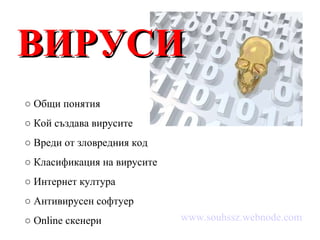 ВИРУСИ ○ Общи понятия ○ Кой създава вирусите ○ Вреди от зловредния код ○ Класификация на вирусите ○ Интернет култура ○ Антивирусен софтуер ○ Online скенери www.souhssz.webnode.com