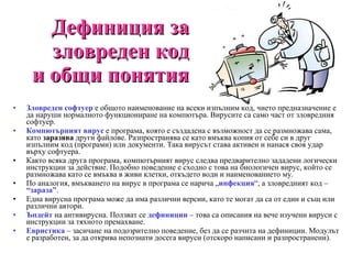 Дефиниция за зловреденкод и общи понятия Зловреден софтуер е общото наименование на всеки изпълним код, чието предназначение е да наруши нормалното функциониране на компютъра. Вирусите са само част от зловредния софтуер. Компютърният вирус е програма, която е създадена с възможност да се размножава сама, като заразява други файлове. Разпространява се като вмъква копия от себе си в друг изпълним код (програми) или документи. Така вирусът става активен и нанася своя удар върху софтуера. Както всяка друга програма, компютърният вирус следва предварително зададени логически инструкции за действие. Подобно поведение е сходно с това на биологичен вирус, който се размножава като се вмъква в живи клетки, откъдето води и наименованието му. По аналогия, вмъкването на вирус в програма се нарича „ инфекция “, а зловредният код – “зараза” . Една вирусна програма може да има различни версии, като те могат да са от един и същ или различни автори. Ъпдейт на антивирусна. Ползват се дефиниции – това са описания на вече изучени вируси с инструкции за тяхното премахване. Евристика – засичане на подозрително поведение, без да се разчита на дефиниции. Модулът е разработен , за да открива непознати досега вируси (отскоро написани и разпространени).