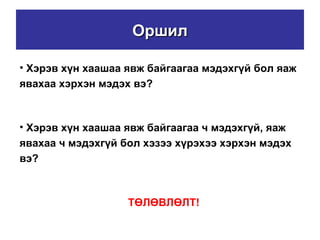 орчны шинжилгээ Судалгааны үндсэн аргууд: • статистик болон бусад мэдээ материал ашиглах • ярилцлага • санал асуулга (чөлөөт, хагас чөлөөт, албан, амаар, бичгээр, утсаар, интернэтээр г.м.) • бүлгийн уулзалт • форум • бодит хэмжилт буюу нарийвчилсан (шинжлэх ухааны) судалгаа Анхаарах зүйлс: • Баталгаатай/найдвартай эх сурвалж ашиглах • Аман мэдээллийг шалгах