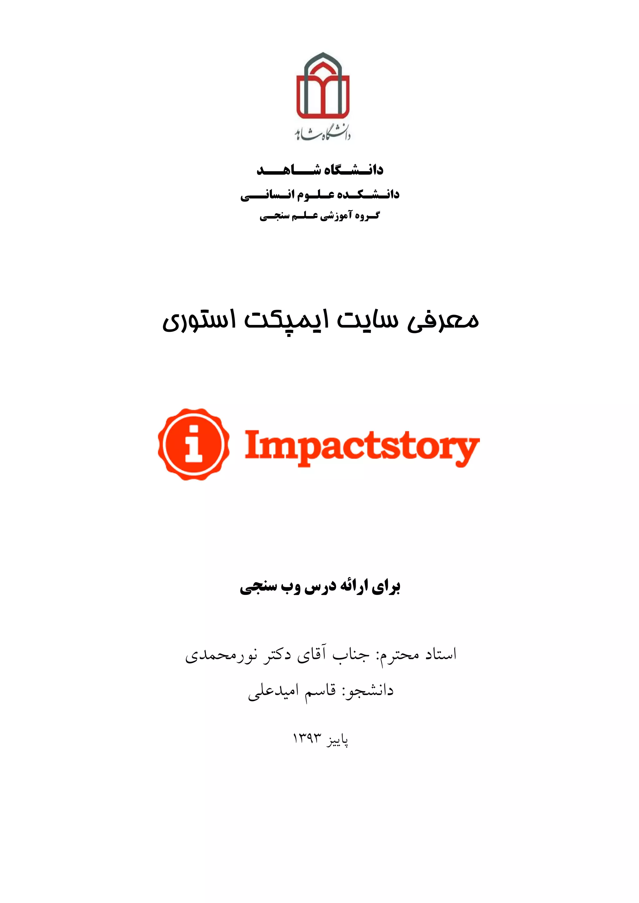 دانـشـكـده سنجـي عـلـن آهوزشي گـروه استوری ایمپکت سایت معرفی درس ارائه برايسنجي وب استبدهحتزم:آقبی جٌبةدكتزًَرهحوذی قبسن :َداًشجاهيذعلي پبييش٩٣١٣