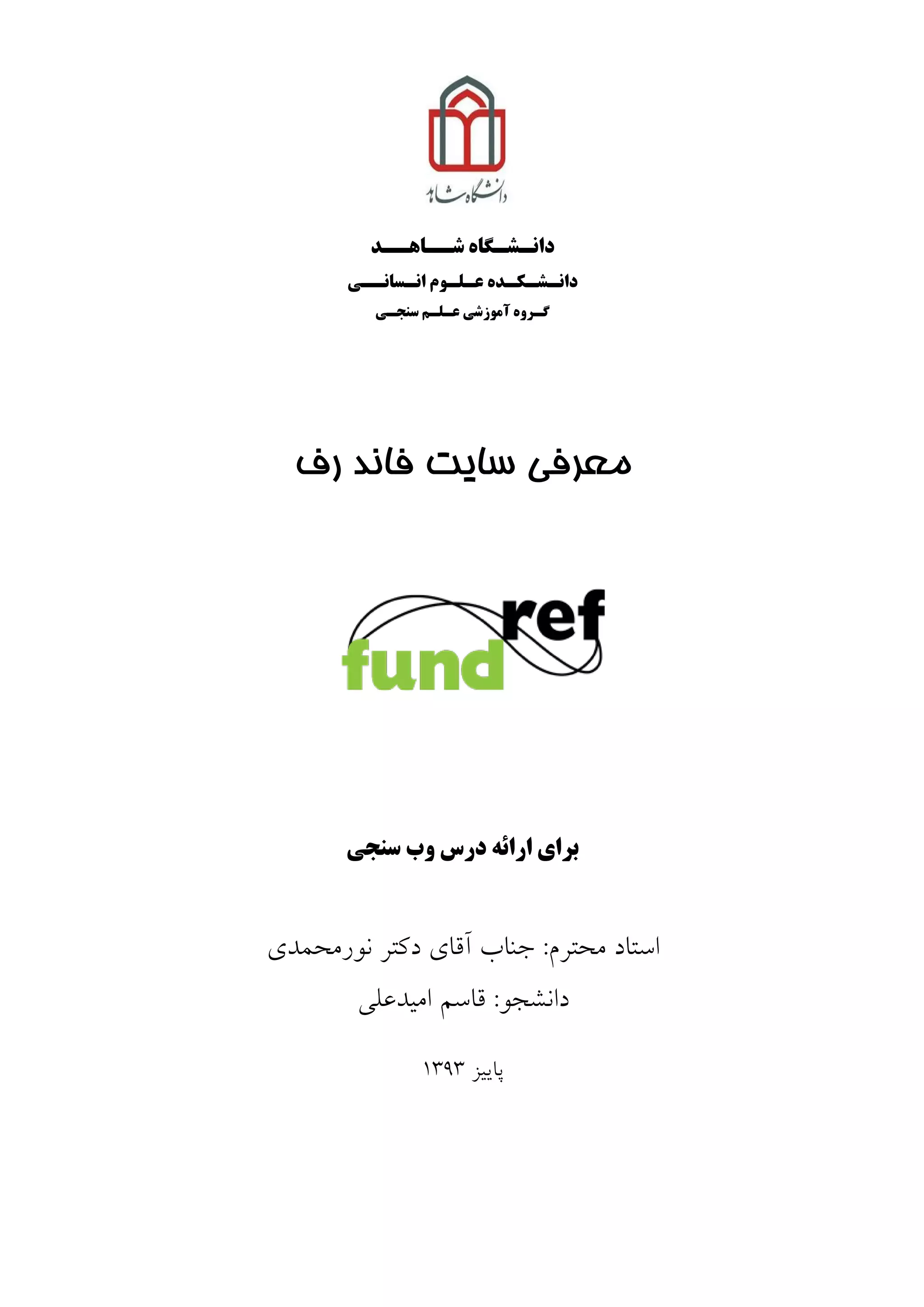 دانشگاه ،سنجی علم ارشد كارشناسی دانشجوي ،اميدعلی قاسم،،g.omid49@gmail.comپایيز3131 3 شناسهایبرایتأمینکنندگانمالی اضپشيٌگشتصوينِگشفتاستدسطشح"سف فاًذ"٩ كٌذ ضشكت،طشح اييسٍشاستاًذاسدیتشای گضاسشاطالعاتهالي.دّذ هي ِاسائسيستنّایپطتيثاًي سا قالة ايي ها.كٌٌذ هي سيستنّایاسسالهاضاهلٌِگضيایتشایهٌثعِتَدجای َُضي ِتاستاًذاسدُضذِاسائدّذ.دساغلة هَاسدضواقادسيذگزاس ِسشهايخَدسااصليستِاسائُضذ.كٌيذ اًتخاب ،دسغيشايي،صَستًالطفآىساِت صَستدستيِاضافكٌيذ.اطالعاتهاليِتعٌَاىُفشادادّاتشایِهقالِپزيشفتُضذخَاّذ َجستج قاتل ٍ تَداصطشيقساتطَجستجسف فاًذدسدستشسعوَمگشفت خَاّذ قشاسٍِهقالضواهيتَاًذتَسطّش كسيِكتاًامحاهيهالي.ضَد تاصياتي ،ًوايذ َجستج سا ضوا ًاضشاىاطالعاتهاليهقاالتٍهطالةديگشساتاُاستفاداصيکِطثقتٌذیاستاًذاسدحوايت تشاساس .كٌٌذ هي ِاسائ هالي كٌٌذگاى.كٌذ هي ِاسائ هالي كٌٌذگاى حوايت اص استاًذاسد تٌذی ِطثق يک سف فاًذ .كٌٌذ هي اًتخاب سا خَد هالي كٌٌذگاى حوايت ،سف فاًذ دفتش طشيق اص ًَيسٌذگاى ٍ ًاضشاى 1 FundRef