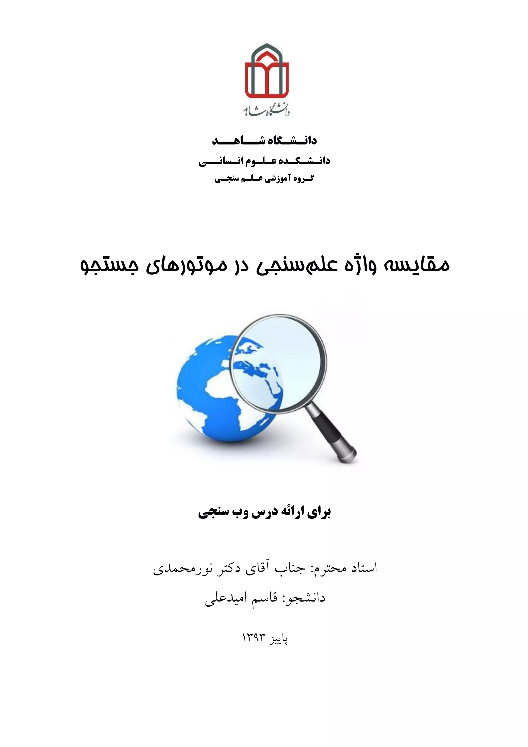 دانـشـكـده سنجـي عـلـن آهوزشي گـروه واژه مقایسهعلمسنجیجستجو موتورهای در درس ارائه برايسنجي وب استادهحترم:آقای جٌابدكترًَرهحوذی اهيذعلي قاسن :َداًشج پاييس٩٣١٣
