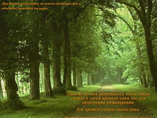История о двух тяжело больных людях, которые общались в больничной палате, где один из них описывал внешний мир, находясь у окна. Когда первый пациент умер, второй обнаружил, что его сосед был слепым и описывал мир, чтобы его поддержать. Эпилог подчеркивает важность счастья в жизни, разделенного с другими, и призывает ценить невидимое богатство.