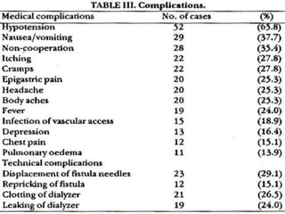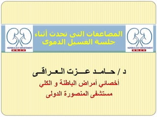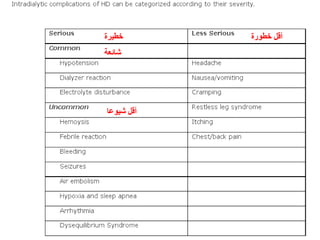 يتناول المستند مضاعفات الغسيل الدموي، مشيرًا إلى انخفاض ضغط الدم وأسباب أخرى مثل ضعف عضلة القلب وفقر الدم. كما يستعرض العلاجات الممكنة مثل إدخال المحاليل والأدوية المقوية للضغط، وأهمية حساب الوزن بدقة لتفادي المضاعفات. بالإضافة إلى ذلك، يتناول المخاطر المرتبطة بالهواء في الدورة الدموية والعلاج اللازم لمثل هذه الحوادث.