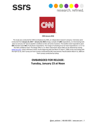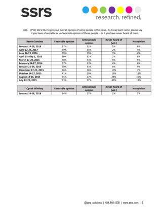A CNN survey conducted by SSRS from January 14-18, 2018, involved 1,005 respondents and assessed opinions on public figures such as Bernie Sanders, Oprah Winfrey, and Joe Biden. Key findings include Sanders with a 57% favorable rating, Winfrey at 64%, and Biden at 58%. The survey also explored voter preferences for hypothetical 2020 presidential candidates, showing Sanders leading Trump 58% to 39%, while Biden would lead 59% to 37%.