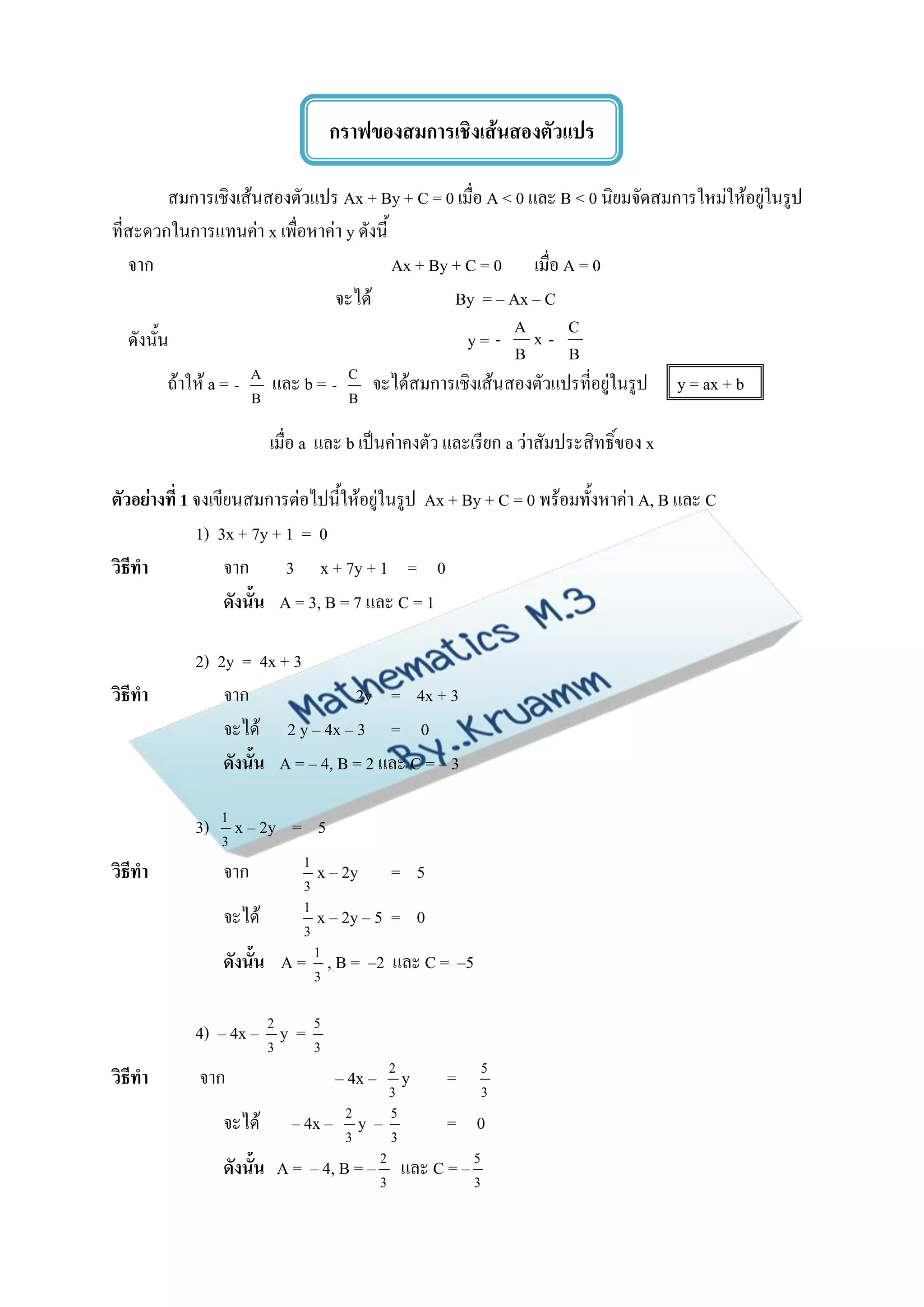 ตัวอย่างที่ 1 จงเขียนสมการต่อไปนี้ให้อยู่ในรูป Ax + By + C = 0 พร้อมทั้งหาค่า A, B และ C