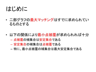 はじめに • 二部グラフの最大マッチングはすでに求められてい るものとする • 以下の関係により最小点被覆が求められれば十分 –