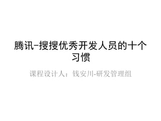 文档概述了腾讯搜搜优秀开发人员的十个习惯,包括提问、获得反馈、简约设计等原则。强调了技术能力、代码管理、自动化以及一致性的重要性,旨在推动开发人员提升技能和工作效率。最终指出态度和结果导向在开发过程中的决定性作用。
