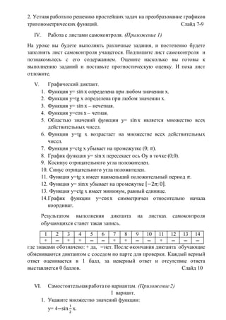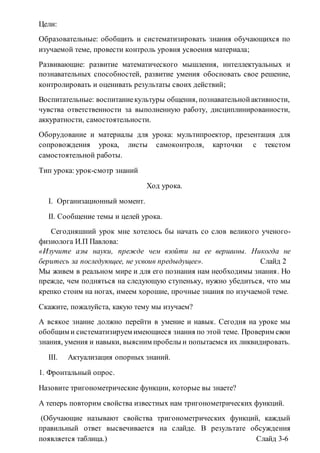 Документ описывает урок по теме 'тригонометрические функции и их свойства', направленный на обобщение и систематизацию знаний учащихся. Урок включает организационный момент, актуализацию знаний, фронтальный опрос, графический диктант и самостоятельную работу с оцениванием. Также предусмотрены групповые задания и итоговая оценка, что способствует развитию математического мышления и интеллектуальных способностей.