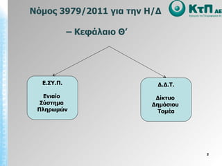 Ενιαίο Σύστημα Πληρωμών(Ε.ΣΥ.Π) – Υπ. Οικονομικών Οι τηλεπικοινωνιακές δαπάνες του κράτους αθροίζονται πλέον κεντρικά Κανένας δημόσιος φορέας δεν μπορεί να συνάπτει τηλ/κες Συμβάσεις Η ΚτΠ Α.Ε. έχει υλοποιήσει ΠΣ (ΤΗΛΕΔ) για την ηλεκτρονική καταχώρηση των λογαριασμών σύμφωνα με τον Νόμο Η ΚτΠ Α.Ε. μέσω Πρ. Σ. με το ΓΛΚ αναλαμβάνει την παραγωγική λειτουργία του ΤΗΛΕΔ και την μηχανογραφική υποστήριξη του ΕΣΥΠ Το ΤΗΛΕΔ (είναι και ..) ρυθμίζει το εθνικό πορτοφόλι του ΣΥΖΕΥΞΙΣ ΙΙ