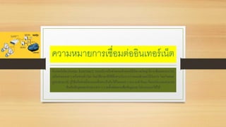 ความหมายการเชื่อมต่ออินเทอร์เน็ต อินเทอร์เน็ต (อังกฤษ: Internet)
