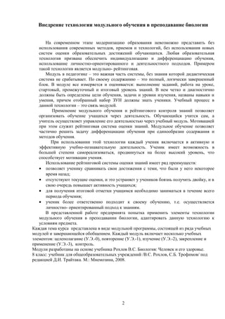 Документ обсуждает внедрение технологии модульного обучения в преподавание биологии, акцентируя внимание на индивидуализации и дифференциации обучения. Модульная система подразумевает использование четких целей, оценок и активного вовлечения учащихся в учебный процесс, что способствует их самореализации и мотивации. В заключение, представлены методические материалы для преподавания, включая учебные планы и модули, адаптированные к условиям предмета.