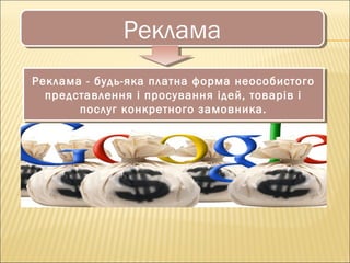 - Реклама інформативна (інформує) - реклама, призначена для інформування громадськості про