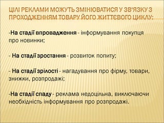 - Стимулююча реклама - націлена на стимулювання потреб покупців;
