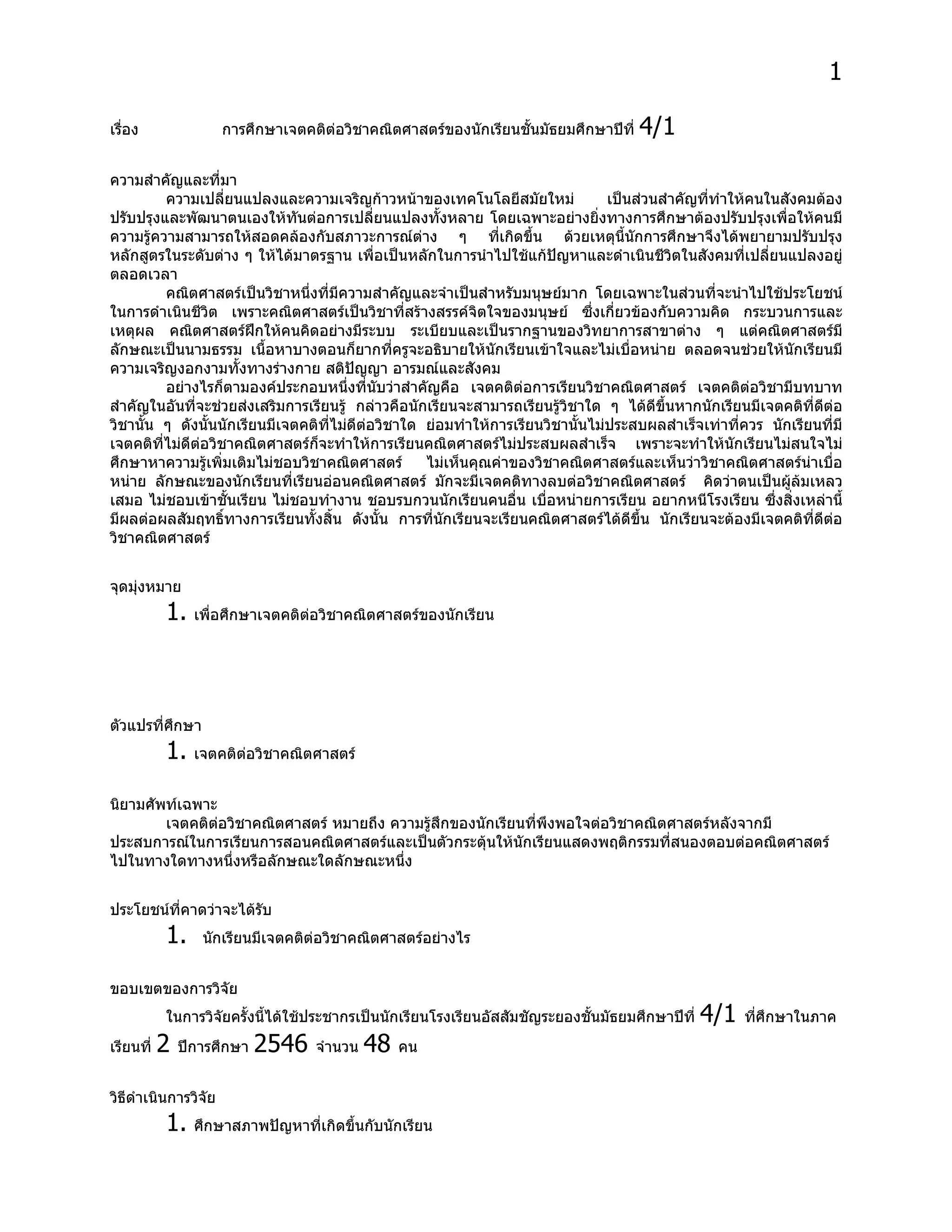 ่ การศึกษาเจตคติต่อวิชาคณิตศาสตร์ของนักเรียนชั้นมัธยมศึกษาปีที่ 4/1