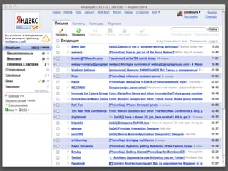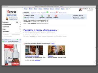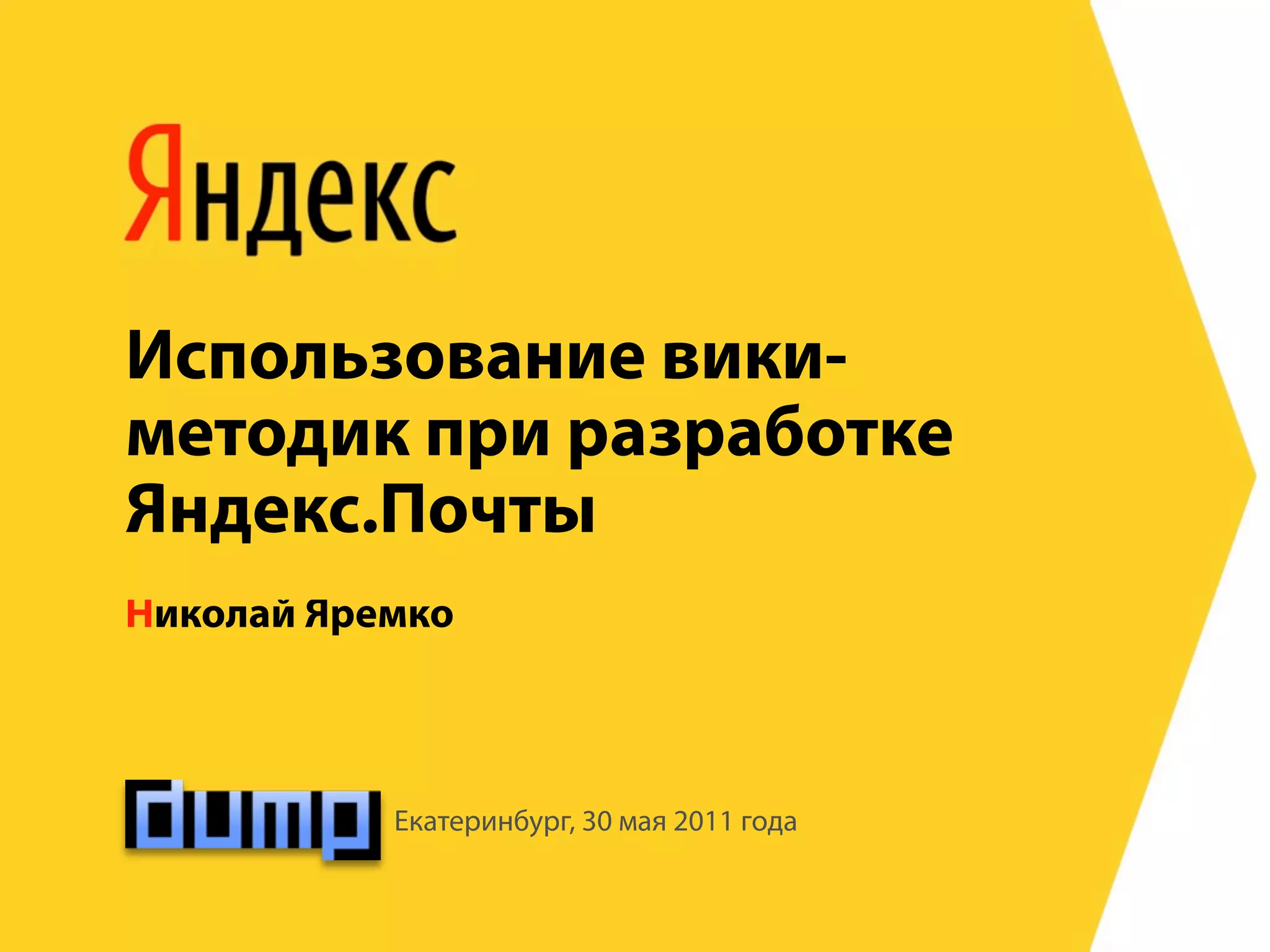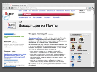 Документ обсуждает использование вики-методик в разработке Яндекс.Почты, указывая на важность коллективного понимания продукта и открытости в дизайне. Описаны проблемы, такие как сложность учета требований и споров вокруг дизайнерских решений, а также предложены рекомендации по улучшению процесса. Внедрение вики-методик позволяет ускорить редизайн и повысить качество продукта.
