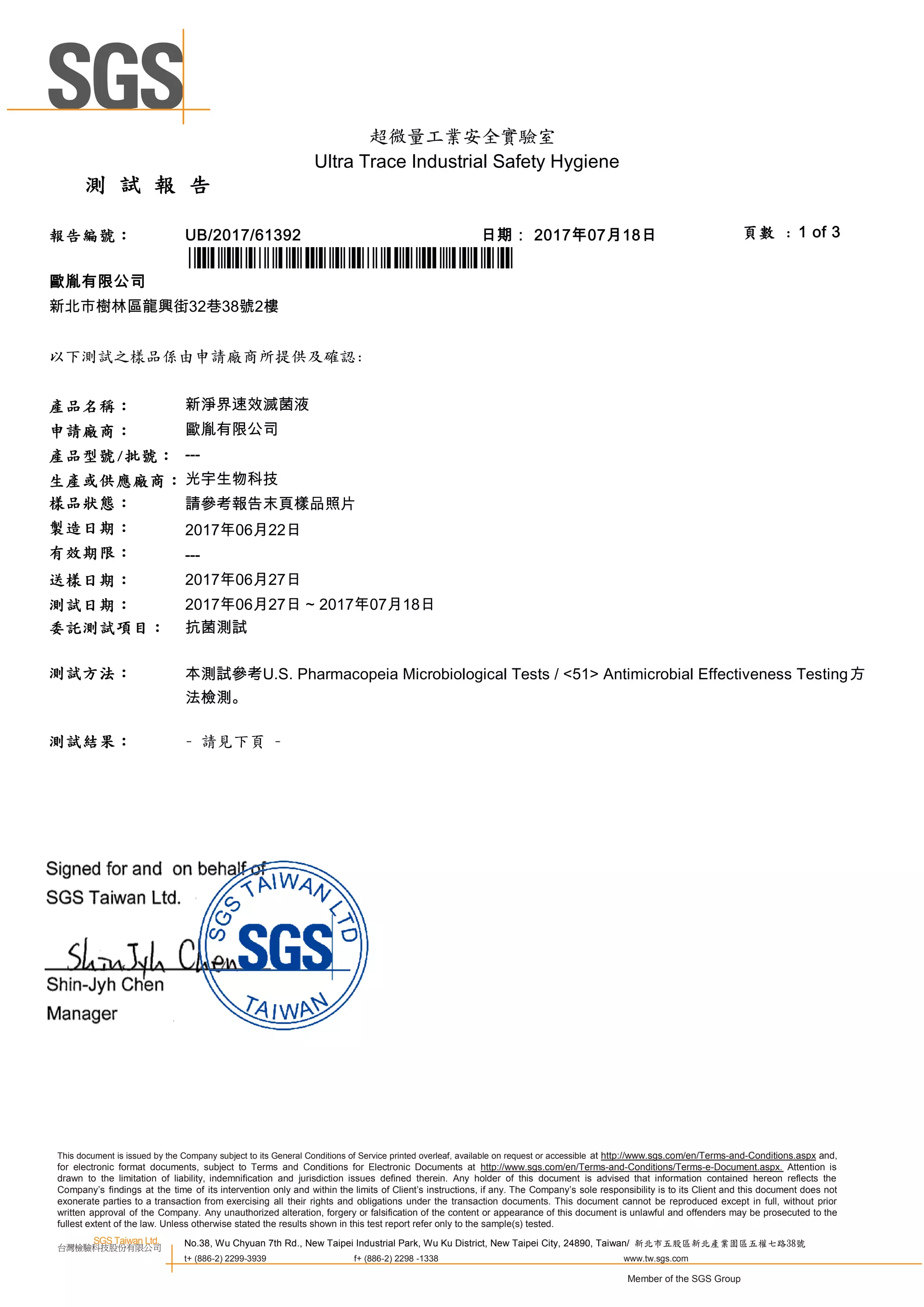 This 3-page test report details the results of an antimicrobial effectiveness test of a product called "Xin Jingjie Sufei Junhuan Liquid" conducted by Ultra Trace Industrial Safety Hygiene Laboratory. The test found that after 5 seconds of exposure, the sample reduced a strain of Klebsiella pneumoniae bacteria by over 99.9%, demonstrating significant antimicrobial effectiveness. The report provides details of the testing methodology used and includes photos of the sample.