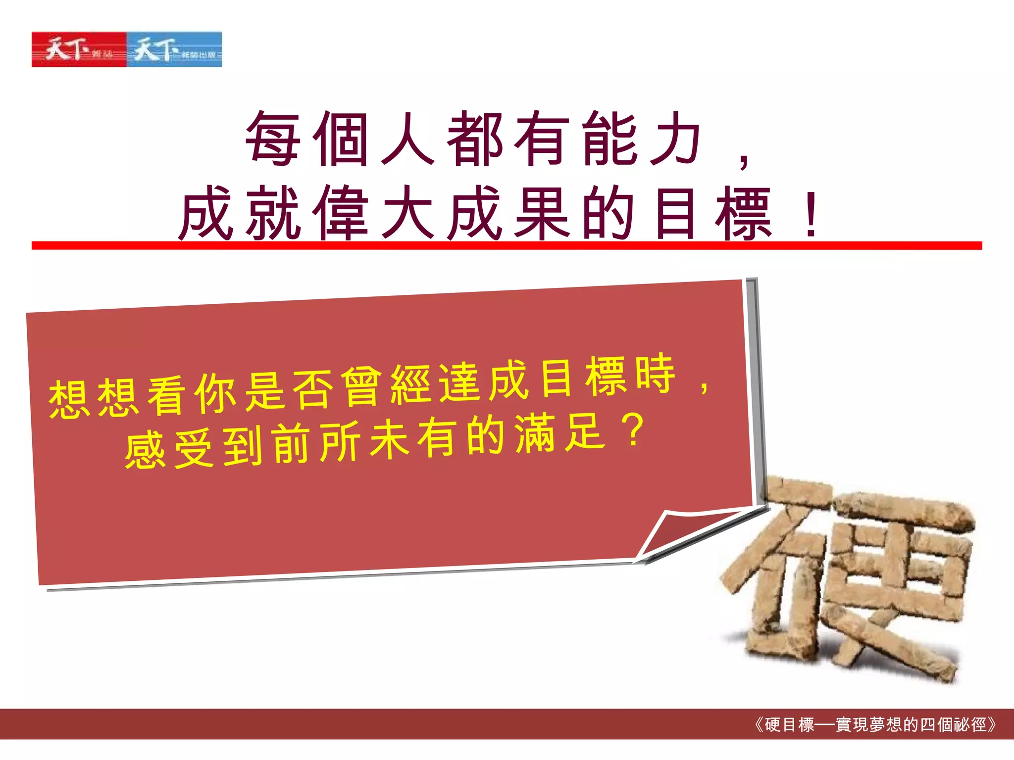 《硬目標──實現夢想的四個祕徑》阐述了设定硬目标的重要性,强调只有内心渴望和高难度挑战的目标才能激励个人实现伟大成果。书中介绍了四个实现梦想的关键方法:找到真实渴望、通过生动想象激发动力、培养紧迫感和设定高难度目标。这本书提供了工具和心理技巧,帮助读者改变思维方式,从而有效达成个人目标。