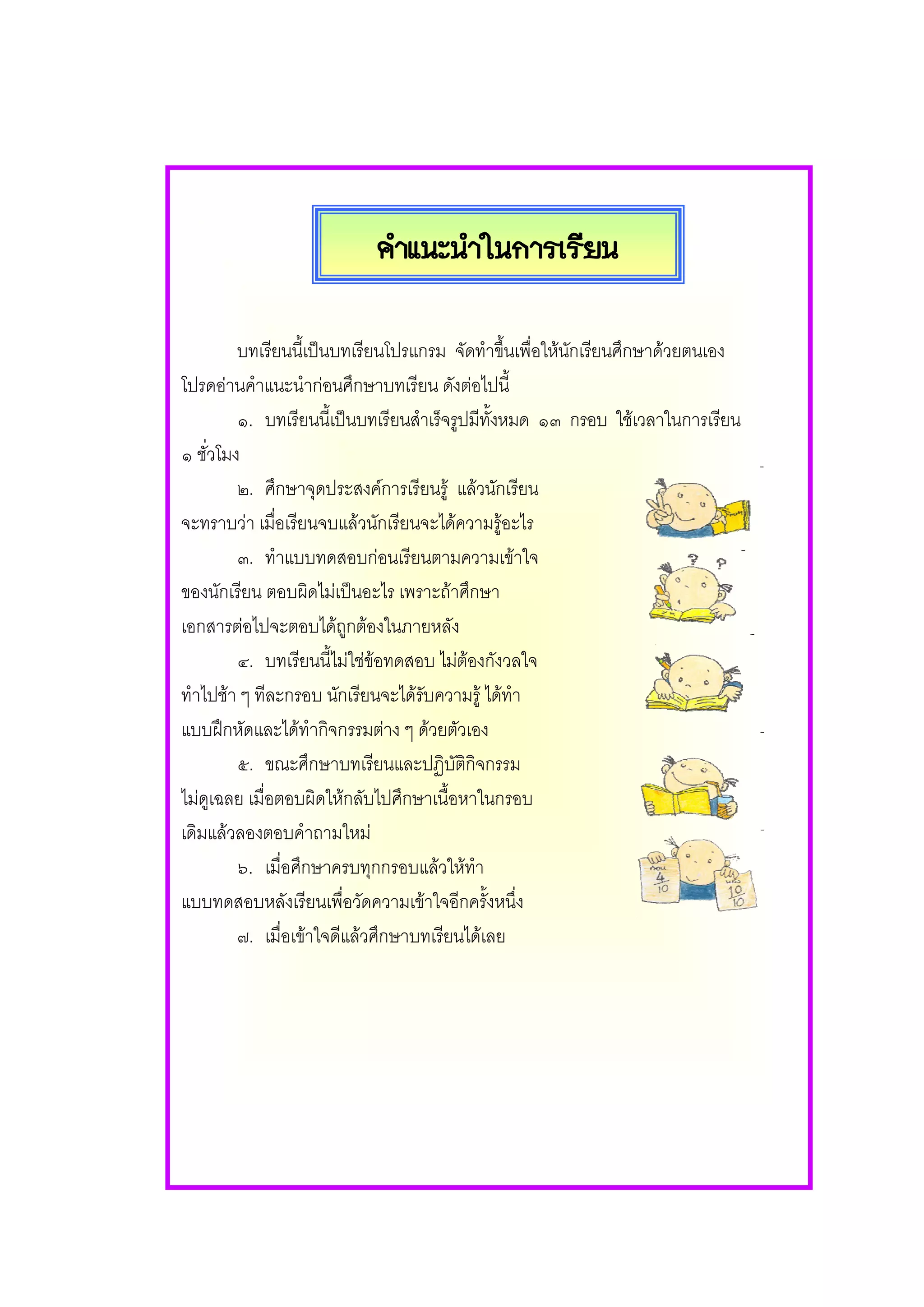 บทเรียนนี้เปนบทเรียนโปรแกรม จัดทําขึนเพื่อใหนกเรียนศึกษาดวยตนเอง ้ ั โปรดอานคําแนะนํากอนศึกษาบทเรียน ดังตอไปนี้ ๑. บทเรียนนี้เปนบทเรียนสําเร็จรูปมีทั้งหมด ๑๓ กรอบ ใชเวลาในการเรียน ๑ ชัวโมง ่ ๒. ศึกษาจุดประสงคการเรียนรู แลวนักเรียน จะทราบวา เมือเรียนจบแลวนักเรียนจะไดความรูอะไร ่ ๓. ทําแบบทดสอบกอนเรียนตามความเขาใจ ของนักเรียน ตอบผิดไมเปนอะไร เพราะถาศึกษา เอกสารตอไปจะตอบไดถูกตองในภายหลัง ๔. บทเรียนนี้ไมใชขอทดสอบ ไมตองกังวลใจ ทําไปชา ๆ ทีละกรอบ นักเรียนจะไดรับความรู ไดทํา แบบฝกหัดและไดทํากิจกรรมตาง ๆ ดวยตัวเอง ๕. ขณะศึกษาบทเรียนและปฏิบัติกิจกรรม ไมดเฉลย เมื่อตอบผิดใหกลับไปศึกษาเนื้อหาในกรอบ ู เดิมแลวลองตอบคําถามใหม ๖. เมื่อศึกษาครบทุกกรอบแลวใหทา ํ แบบทดสอบหลังเรียนเพื่อวัดความเขาใจอีกครั้งหนึ่ง ๗. เมื่อเขาใจดีแลวศึกษาบทเรียนไดเลย