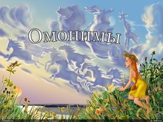 Документ обсуждает языковое явление омонимии и многозначности слов, приводя примеры различных типов омонимов: омофонов, омоформ и омографов. В нем также рассматриваются их отличия, примеры использования в предложениях и загадки, связанные с омонимами. Основное внимание уделяется пониманию значений слов и их контекстуальной зависимости.