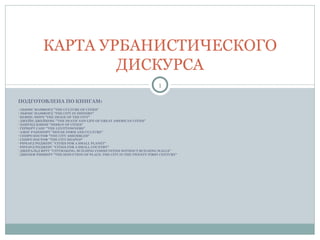 Документ представляет собой обширное исследование урбанистического дискурса на основе работ известных авторов, таких как Льюис Мамфорд и Джейн Джекобс. Основное внимание уделяется вопросам устойчивости городов, влиянию автомобилей на городскую жизнь и новому участию граждан в процессе принятия решений. Также рассматриваются основные концепции и методы планирования современного города и его будущего.