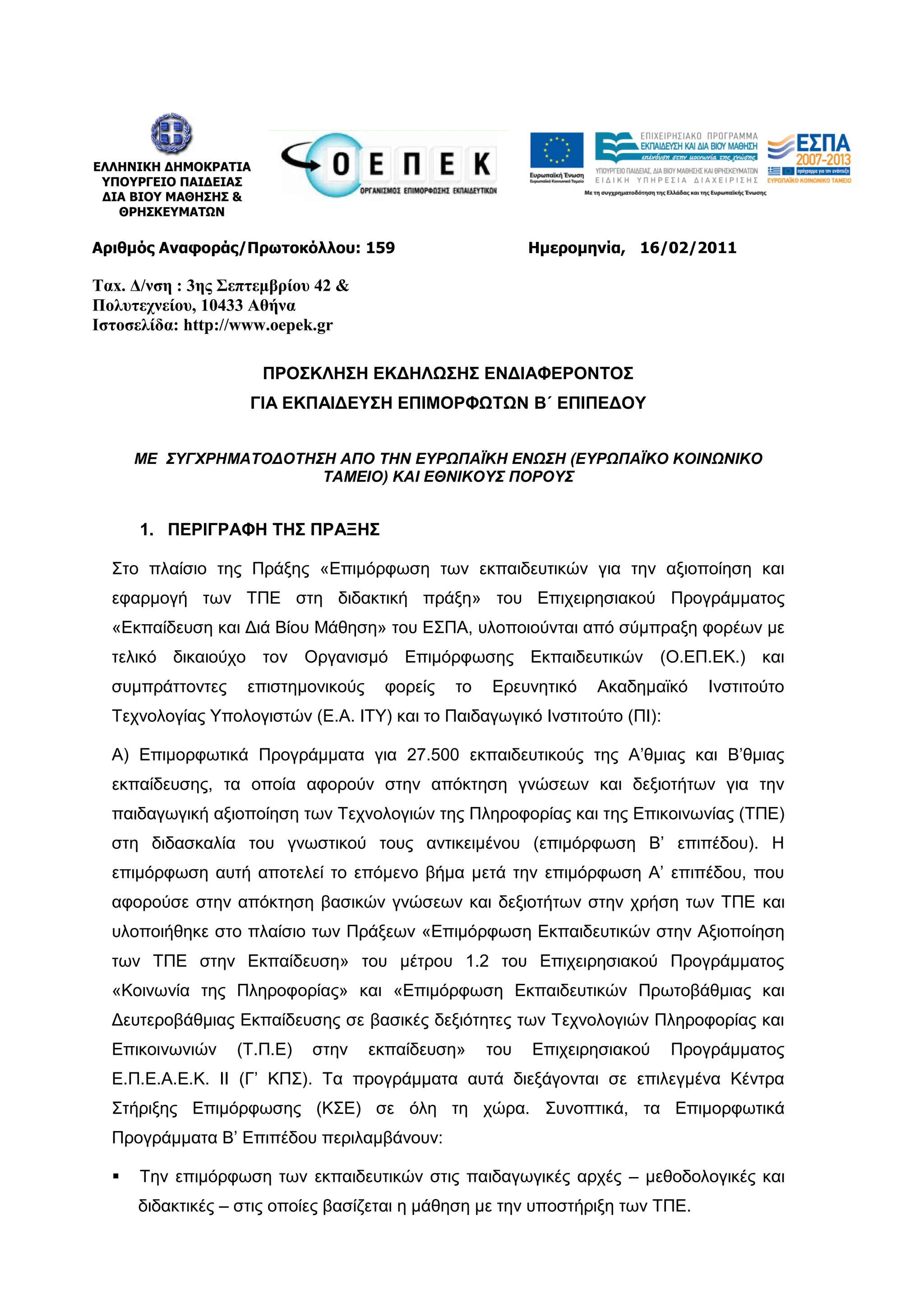 ΠΑΙΓΔΙΑ ΓΙΑ ΒΙΟΤ ΜΑΘΗΗ & ΘΡΗΚΔΤΜΑΣΩΝ Αριθμός Αναφοράς/Πρωτοκόλλοσ: 159 Ημερομηνία, 16/02/2011 Ταx. Δ/νζη : 3ης Σεπηεμβρίοσ 42 & Πολσηετνείοσ, 10433 Αθήνα Ιζηοζελίδα: http://www.oepek.gr ΠΡΟΚΛΗΗ ΔΚΓΗΛΩΗ ΔΝΓΙΑΦΔΡΟΝΣΟ ΓΙΑ ΔΚΠΑΙΓΔΤΗ ΔΠΙΜΟΡΦΩΣΩΝ Β΄ ΔΠΙΠΔΓΟΤ ΜΔ ΤΓΥΡΗΜΑΣΟΓΟΣΗΗ ΑΠΟ ΣΗΝ ΔΤΡΩΠΑΪΚΗ ΔΝΩΗ (ΔΤΡΩΠΑΪΚΟ ΚΟΙΝΩΝΙΚΟ ΣΑΜΔΙΟ) ΚΑΙ ΔΘΝΙΚΟΤ ΠΟΡΟΤ 1. ΠΔΡΙΓΡΑΦΗ ΣΗ ΠΡΑΞΗ ην πιαίζην ηεο Πξάμεο «Δπηκφξθσζε ησλ εθπαηδεπηηθψλ γηα ηελ αμηνπνίεζε θαη εθαξκνγή ησλ ΣΠΔ ζηε δηδαθηηθή πξάμε» ηνπ Δπηρεηξεζηαθνχ Πξνγξάκκαηνο «Δθπαίδεπζε θαη Γηά Βίνπ Μάζεζε» ηνπ ΔΠΑ, πινπνηνχληαη απφ ζχκπξαμε θνξέσλ κε ηειηθφ δηθαηνχρν ηνλ Οξγαληζκφ Δπηκφξθσζεο Δθπαηδεπηηθψλ (Ο.ΔΠ.ΔΚ.) θαη ζπκπξάηηνληεο επηζηεκνληθνχο θνξείο ην Δξεπλεηηθφ Αθαδεκατθφ Ηλζηηηνχην Σερλνινγίαο Τπνινγηζηψλ (Δ.Α. ΗΣΤ) θαη ην Παηδαγσγηθφ Ηλζηηηνχην (ΠΗ): Α) Δπηκνξθσηηθά Πξνγξάκκαηα γηα 27.500 εθπαηδεπηηθνχο ηεο Α’ζκηαο θαη Β’ζκηαο εθπαίδεπζεο, ηα νπνία αθνξνχλ ζηελ απφθηεζε γλψζεσλ θαη δεμηνηήησλ γηα ηελ παηδαγσγηθή αμηνπνίεζε ησλ Σερλνινγηψλ ηεο Πιεξνθνξίαο θαη ηεο Δπηθνηλσλίαο (ΣΠΔ) ζηε δηδαζθαιία ηνπ γλσζηηθνχ ηνπο αληηθεηκέλνπ (επηκφξθσζε Β’ επηπέδνπ). Ζ επηκφξθσζε απηή απνηειεί ην επφκελν βήκα κεηά ηελ επηκφξθσζε Α’ επηπέδνπ, πνπ αθνξνχζε ζηελ απφθηεζε βαζηθψλ γλψζεσλ θαη δεμηνηήησλ ζηελ ρξήζε ησλ ΣΠΔ θαη πινπνηήζεθε ζην πιαίζην ησλ Πξάμεσλ «Δπηκφξθσζε Δθπαηδεπηηθψλ ζηελ Αμηνπνίεζε ησλ ΣΠΔ ζηελ Δθπαίδεπζε» ηνπ κέηξνπ 1.2 ηνπ Δπηρεηξεζηαθνχ Πξνγξάκκαηνο «Κνηλσλία ηεο Πιεξνθνξίαο» θαη «Δπηκφξθσζε Δθπαηδεπηηθψλ Πξσηνβάζκηαο θαη Γεπηεξνβάζκηαο Δθπαίδεπζεο ζε βαζηθέο δεμηφηεηεο ησλ Σερλνινγηψλ Πιεξνθνξίαο θαη Δπηθνηλσληψλ (Σ.Π.Δ) ζηελ εθπαίδεπζε» ηνπ Δπηρεηξεζηαθνχ Πξνγξάκκαηνο Δ.Π.Δ.Α.Δ.Κ. II (Γ’ ΚΠ). Σα πξνγξάκκαηα απηά δηεμάγνληαη ζε επηιεγκέλα Κέληξα ηήξημεο Δπηκφξθσζεο (ΚΔ) ζε φιε ηε ρψξα. πλνπηηθά, ηα Δπηκνξθσηηθά Πξνγξάκκαηα Β’ Δπηπέδνπ πεξηιακβάλνπλ: Σελ επηκφξθσζε ησλ εθπαηδεπηηθψλ ζηηο παηδαγσγηθέο αξρέο – κεζνδνινγηθέο θαη δηδαθηηθέο – ζηηο νπνίεο βαζίδεηαη ε κάζεζε κε ηελ ππνζηήξημε ησλ ΣΠΔ.