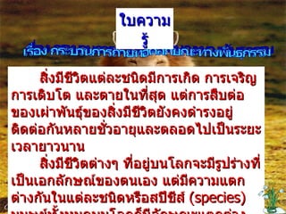 เรื่อง กระบวนการถ่ายทอดลักษณะทางพันธุกรรม สิ่งมีชีวิตแต่ละชนิดมีการเกิดการเจริญ การเติบโต และตายในที่สุด แต่การสืบต่อของเผ่าพันธุ์ของสิ่งมีชีวิตยังคงดำรงอยู่ติดต่อกันหลายชั่วอายุและตลอดไปเป็นระยะเวลายาวนาน สิ่งมีชีวิตต่างๆ ที่อยู่บนโลกจะมีรูปร่างที่เป็นเอกลักษณ์ของตนเอง แต่มีความแตกต่างกันในแต่ละชนิดหรือสปีชีส์ (species) มนุษย์ทั้งหมดบนโลกก็มีลักษณะแตกต่างกัน เช่น บางคนผิวดำ บางคนผิวขาว บางคนตาสีดำ บางคนตาสีฟ้า เป็นต้น นักเรียนคิดว่ามนุษย์ทั้งหมดบนโลกเป็นชนิดหรือสปีชีส์เดียวกันหรือไม่ ใบความรู้ - 3.