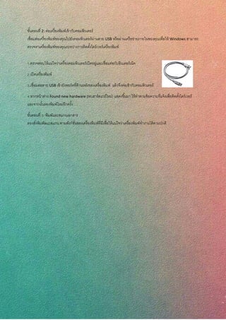 ชั้นม.5/1 เลขที่ 26 ขั้นตอนที่ 2: ต่อเครื่องพิมพ์เข้ากับคอมพิวเตอร์ เชื่อมต่อเครื่องพิมพ์ของคุณไปยังคอมพิวเตอร์ผ่านสาย USB หรือผ่านเครือข่ายภายในของคุณเพื่อให้ Windows สามารถ ตรวจหาเครื่องพิมพ์ของคุณระหว่างการติดตั้งไดร์เวอร์เครื่องพิมพ์ 1.ตรวจสอบให้แน่ใจว่าเครื่องคอมพิวเตอร์เปิดอยู่และเชื่อมต่อกับอินเตอร์เน็ต 2.เปิดเครื่องพิมพ์ 3.เชื่อมต่อสาย USB เข้ายังพอร์ตที่ด้านหลังของเครื่องพิมพ์ แล้วจึงต่อเข้ากับคอมพิวเตอร์ 4.หากหน้าต่าง Found new hardware (พบฮาร์ดแวร์ใหม่) แสดงขึ้นมา ให้ทาตามข้อความที่แจ้งเพื่อติดตั้งไดร์เวอร์ และจากนั้นลองพิมพ์ใหม่อีกครั้ง ขั้นตอนที่ 3: พิมพ์และสแกนเอกสาร ลองสั่งพิมพ์ลแะสแกน ตามฟังก์ชั่นของเครื่องพิมพ์ที่มีเพื่อให้แน่ใจว่าเครื่องพิมพ์ทางานได้ตามปกติ