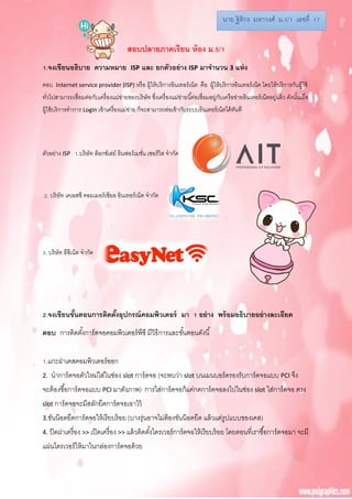 ความหมาย ISP และ ยกตัวอย่าง ISP มาจานวน 3 แห่ง ตอบ Internet service provider (ISP) หรือ ผู้ให้บริการอินเทอร์เน็ต คือ ผู้ให้บริการอินเทอร์เน็ต โดยให้บริการกับผู้ใช้ ทั่วไปสามารถเชื่อมต่อกับเครื่องแม่ข่ายของบริษัท ซึ่งเครื่องแม่ข่ายนี้ต่อเชื่อมอยู่กับเครือข่ายอินเตอร์เน็ตอยู่แล้ว ดังนั้นเมื่อ ผู้ใช้บริการทาการ Login เข้าเครื่องแม่ข่าย ก็จะสามารถต่อเข้ากับระบบอินเตอร์เน็ตได้ทันที ตัวอย่าง ISP 1.บริษัท ล็อกซ์เล่ย์ อินฟอร์เมชั่น เซอร์วิส จากัด 2. บริษัท เคเอสซี คอมเมอร์เชียล อินเทอร์เน็ต จากัด 3. บริษัท อีซีเน็ต จากัด 2.จงเขียนขั้นตอนการติดตั้งอุปกรณ์คอมพิวเตอร์ มา 1 อย่าง พร้อมอธิบายอย่างละเอียด ตอบ การติดตั้งการ์ดจอคอมพิวเตอร์พีซี มีวิธีการและขั้นตอนดังนี้ 1.แกะฝาเคสคอมพิวเตอร์ออก 2. นาการ์ดจอตัวใหม่ใส่ในช่อง slot การ์ดจอ (จะพบว่า slot บนเมนบอร์ดรองรับการ์ดจอแบบ PCI จึง จะต้องซื้อการ์ดจอแบบ PCI มาดังภาพ) การใส่การ์ดจอก็แค่กดการ์ดจอลงไปในช่อง slot ใส่การ์ดจอ ตรง slot การ์ดจอจะมีสลักยึดการ์ดจอเอาไว้ 3.ขันน๊อตยึดการ์ดจอให้เรียบร้อย (บางรุ่นอาจไม่ต้องขันน๊อตยึด แล้วแต่รูปแบบของเคส) 4. ปิดฝาเครื่อง >> เปิดเครื่อง >> แล้วติดตั้งไดรเวอร์การ์ดจอให้เรียบร้อย โดยตอนที่เราซื้อการ์ดจอมา จะมี แผ่นไดรเวอร์ให้มาในกล่องการ์ดจอด้วย นาย ฐิติกร มหาวงศ์ ม.5/1 เลขที่ 17
