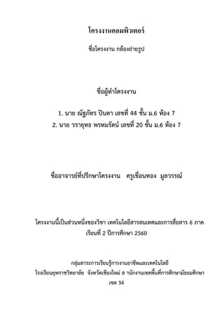 Camera ) ประเภทโครงงาน โครงงานศึกษาค้นคว้าเพื่อพัฒนา ชื่อผู้ทาโครงงาน นายณัฐภัทร ปินตา นายวรายุทธ พรหมรัตน์ ชื่อที่ปรึกษา นางเขื่อนทอง มูลวรรณ์ รายวิชา เทคโนโลยีสารสนเทศและการสื่อสาร กลุ่มสาระการเรียนรู้ การงานอาชีพและเทคโนโลยี ปีการศึกษา 2/2560 บทคัดย่อ โครงงานคอมพิวเตอร์ เรื่อง กล้องถ่ายรูป ( Camera ) จัดทาขึ้นโดยมีวัตถุประสงค์ 1) เพื่อศึกษารูปแบบกล้องต่างๆ 2) เพื่อศึกษาวิธีการถ่ายรูปในแนวต่างๆ 3)เพื่อศึกษาและ ส่งเสริมพัฒนาคุณภาพกล้องให้ดียิ่งขึ้น 4) เพื่อเผยแพร่ความรู้เกี่ยวกับการการถ่ายรูปสาหรับ คนที่สนใจในการถ่ายภาพ โดยมีเครื่องมือและอุปกรณ์คือ เว็บไซต์สาหรับเผยแพร่ข้อมูลที่ได้ ศึกษา PowerPoint ในการนาเสนอโครงงานและรูปเล่มโครงงาน ส่วนแนวทางการดาเนินงาน จะเริ่มตั้งแต่ กาหนดหัวข้อที่ ต้องการศึกษา รวบรวมข้อมูลที่ต้องการศึกษา ทาโครงร่าง โครงงาน เริ่มทาการศึกษาตามหัวข้อที่ กาหนด รวบรวมข้อมูลต่างๆ แล้วสุดท้ายเรียบเรียงเป็น โครงงานให้สมบูรณ์ที่สุด หลังจากการศึกษา ได้สรุปผลการดาเนินงานดังนี้ ทาให้ผู้จัดทาและผู้ ที่สนใจได้รับความรู้ในเรื่อง กล้องถ่ายรูปและการถ่ายภาพ และสามารถนามาปรับใช้ในชีวิต ประจา มาวันหรือทาเป็น อาชีพเสริมได้