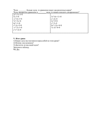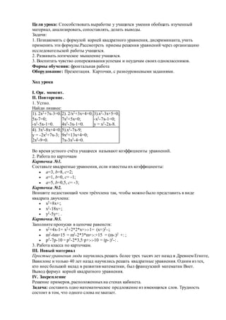 Урок направлен на развитие навыков обобщения, анализа и применения формул корней квадратного уравнения и дискриминанта у учащихся. Основные задачи включают развитие логического мышления и сопереживание успехам одноклассников. В ходе занятия используются карточки с заданиями, обсуждение нового материала и закрепление пройденного.