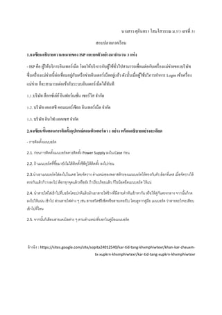 ม.5/3 เลขที่ 31 สอบปลายภาคเรียน 1.จงเขียนอธิบายความหมายของ ISP และยกตัวอย่างมาจานวน 3 แห่ง - ISP คือ ผู้ให้บริการอินเทอร์เน็ต โดยให้บริการกับผู้ใช้ทั่วไปสามารถเชื่อมต่อกับเครื่องแม่ข่ายของบริษัท ซึ่งเครื่องแม่ข่ายนี้ต่อเชื่อมอยู่กับเครือข่ายอินเตอร์เน็ตอยู่แล้ว ดังนั้นเมื่อผู้ใช้บริการทาการ Login เข้าเครื่อง แม่ข่าย ก็จะสามารถต่อเข้ากับระบบอินเตอร์เน็ตได้ทันที 1.1.บริษัท ล็อกซ์เล่ย์อินฟอร์เมชั่น เซอร์วิส จากัด 1.2. บริษัท เคเอสซี คอมเมอร์เชียล อินเทอร์เน็ต จากัด 1.3. บริษัท อินโฟ แอคเซส จากัด 2.จงเขียนขั้นตอนการติดตั้งอุปกรณ์คอมพิวเตอร์มา 1 อย่าง พร้อมอธิบายอย่างละเอียด - การติดตั้งเมนบอร์ด 2.1. ก่อนการติดตั้งเมนบอร์ดควรติดตั้ง Power Supply ลงใน Case ก่อน 2.2. ถ้าเมนบอร์ดที่ซื้อมายังไม่ได้ติดตั้งซีพียูให้ติดตั้ง ลงไปก่อน 2.3.นาเอาเมนบอร์ดใส่ลงไปในเคส โดยจัดวาง ตาแหน่งของพลาสติกรองเมนบอร์ดให้ตรงกับตัว ล็อกที่เคส เมื่อจัดวางให้ ตรงกันแล้วก็วางลงไป ล็อกทุกจุดแล้วหรือยัง ถ้าเรียบร้อยแล้ว ก็ไขน็อตยึดเมนบอร์ด ให้แน่ 2.4. นาสายไฟใส่เข้าไปที่บอร์ดโดยปกติแล้วมักเอาสายไฟข้างที่มีสายดาหันเข้าหากัน หรือให้คู่กันตรงกลาง จากนั้นก็กด ลงไปให้แน่น เข้าไป ส่วนสายไฟต่าง ๆ เช่น สายสวิตซ์รีเซ็ตหรือสายเทอร์โบ โดยดูจากคู่มือ เมนบอร์ด ว่าสายอะไรจะเสียบ เข้าไปที่ไหน 2.5. จากนั้นก็เสียบสายเคเบิลต่าง ๆ ตามตาแหน่งที่บอกในคู่มือเมนบอร์ด อ้างอิง : https://sites.google.com/site/sopita24012540/kar-tid-tang-khxmphiwtexr/khan-kar-cheuxm- tx-xupkrn-khxmphiwtexr/kar-tid-tang-xupkrn-khxmphiwtexr