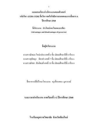 เทคโนโลยีสารสนเทศและการสื่อสาร 6 ปีการศึกษา 2560 ชื่อโครงงาน ประโยชน์และโทษของชาเขียว (Advantages and disadvantages of green tea) ชื่อผู้ทาโครงงาน นางสาวณิชมน ใหม่แปลง เลขที่ 6 ชั้น มัธยมศึกษาปีที่ 6 ห้อง 6 นางสาวสุพิชญา พิทาคา เลขที่ 7 ชั้น มัธยมศึกษาปีที่ 6 ห้อง 6 นางสาวณัชชา สันติพงศ์เลขที่ 10 ชั้น มัธยมศึกษาปีที่ 6 ห้อง 6 ชื่ออาจารย์ที่ปรึกษาโครงงาน ครูเขื่อนทอง มูลวรรณ์ ระยะเวลาดาเนินงาน ภาคเรียนที่ 1-2 ปีการศึกษา 2560 โรงเรียนยุพราชวิทยาลัย จังหวัดเชียงใหม่