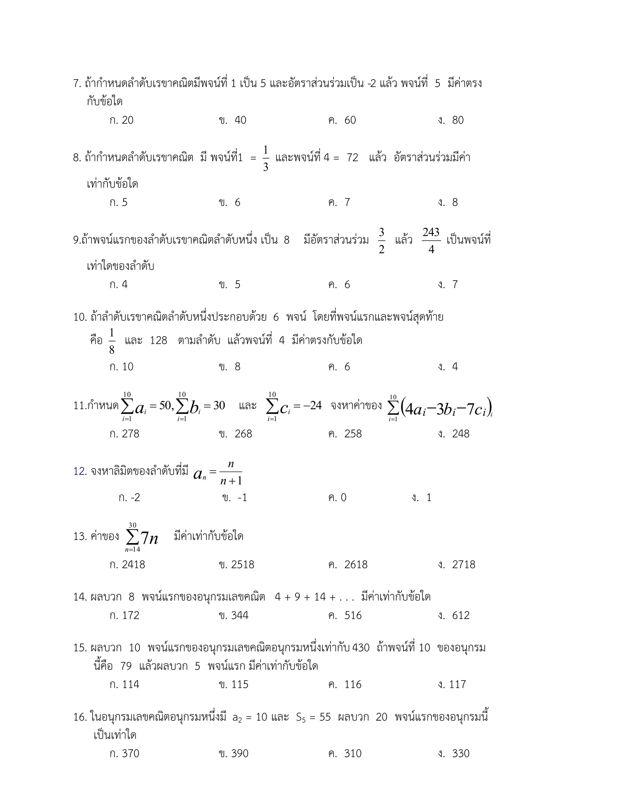 เป็น 5 และอัตราส่วนร่วมเป็น -2 แล้ว พจน์ที่ 5 มีค่าตรง กับข้อใด ก. 20 ข. 40 ค. 60 ง. 80 1 8. ถ้ากาหนดลาดับเรขาคณิต มี พจน์ท1 = ี่ และพจน์ที่ 4 = 72 แล้ว อัตราส่วนร่วมมีค่า 3 เท่ากับข้อใด ก. 5 ข. 6 ค. 7 ง. 8 3 243 9.ถ้าพจน์แรกของลาดับเรขาคณิตลาดับหนึ่ง เป็น 8 มีอัตราส่วนร่วม แล้ว เป็นพจน์ที่ 2 4 เท่าใดของลาดับ ก. 4 ข. 5 ค. 6 ง. 7 10. ถ้าลาดับเรขาคณิตลาดับหนึ่งประกอบด้วย 6 พจน์ โดยที่พจน์แรกและพจน์สุดท้าย คือ 1 และ 128 ตามลาดับ แล้วพจน์ที่ 4 มีค่าตรงกับข้อใด 8 ก. 10 ข. 8 ค. 6 ง. 4 11.กาหนด ai 50, bi 30 และ ci 24 จงหาค่าของ 4a i 3bi 7ci 10 10 10 10 i i 1 i 1 i 1 i 1 ก. 278 ข. 268 ค. 258 ง. 248 n 12. จงหาลิมิตของลาดับที่มี an n 1 ก. -2 ข. -1 ค. 0 ง. 1 30 13. ค่าของ 7n มีค่าเท่ากับข้อใด n 14 ก. 2418 ข. 2518 ค. 2618 ง. 2718 14. ผลบวก 8 พจน์แรกของอนุกรมเลขคณิต 4 + 9 + 14 + . . . มีค่าเท่ากับข้อใด ก. 172 ข. 344 ค. 516 ง. 612 15. ผลบวก 10 พจน์แรกของอนุกรมเลขคณิตอนุกรมหนึ่งเท่ากับ 430 ถ้าพจน์ที่ 10 ของอนุกรม นี้คือ 79 แล้วผลบวก 5 พจน์แรก มีค่าเท่ากับข้อใด ก. 114 ข. 115 ค. 116 ง. 117 16. ในอนุกรมเลขคณิตอนุกรมหนึ่งมี a2 = 10 และ S5 = 55 ผลบวก 20 พจน์แรกของอนุกรมนี้ เป็นเท่าใด ก. 370 ข. 390 ค. 310 ง. 330
