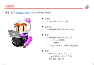 ハッカドール立ち上げ Gunosy – 新規事業開発室マネージャー 業務 – 新規事業の少人数立ち上げ – ニュースパス – バザリー – ブロックチェーン領域の研究開発 担当 – サーバーサイド, インフラ DBスキーマにうるさい – 時々iOS, 時々PO 榎本 悠介 @mosa_siru (ボンバーマンの人)