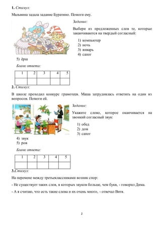 Документ содержит серию учебных заданий для детей, направленных на развитие навыков работы с русским языком, включая фонетику, ударение и слоговое деление. Каждое задание предлагает помощь персонажам, сквозь которые дети проверяют свои знания и находят правильные ответы. Вопросы охватывают различные аспекты языка, такие как мягкие и твердые согласные, звонкие и глухие звуки, а также количество слогов в словах.