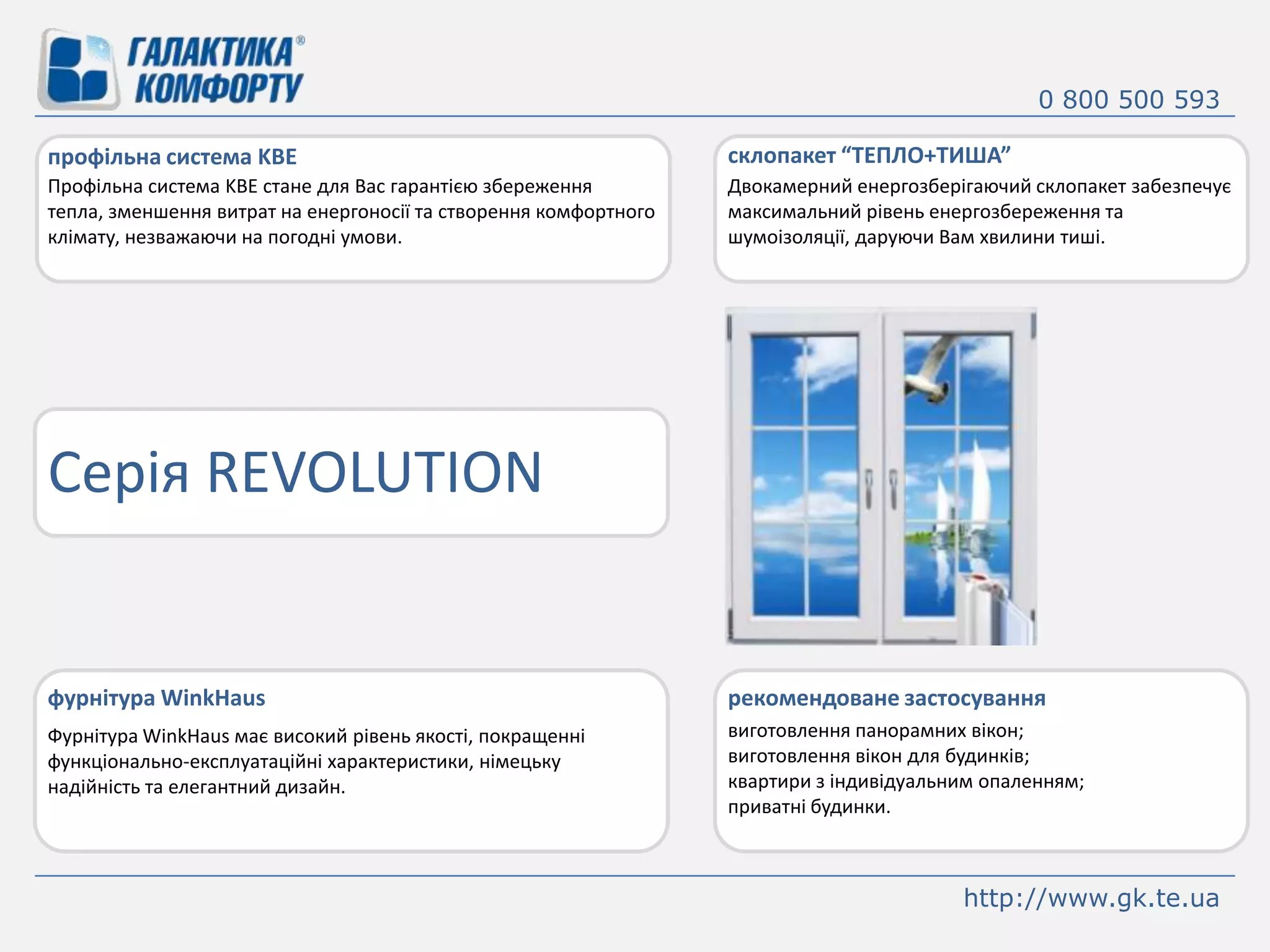 0 800 500593склопакет “ТЕПЛО+ТИША”профільна система KBEПрофільна система KBE стане для Вас гарантієюзбереження тепла, зменшеннявитрат на енергоносії та створення комфортного клімату, незважаючи на погодніумови.Двокамерний енергозберігаючий склопакет забезпечує максимальний рівень енергозбереження та шумоізоляції, даруючи Вам хвилини тиші.Серія REVOLUTIONфурнітура WinkHausрекомендоване застосуваннявиготовленняпанорамнихвікон;виготовленнявікон для будинків;квартири з індивідуальнимопаленням;приватнібудинки.Фурнітура WinkHausмає високий рівень якості, покращенні функціонально-експлуатаційні характеристики, німецьку надійність та елегантний дизайн.http://www.gk.te.ua