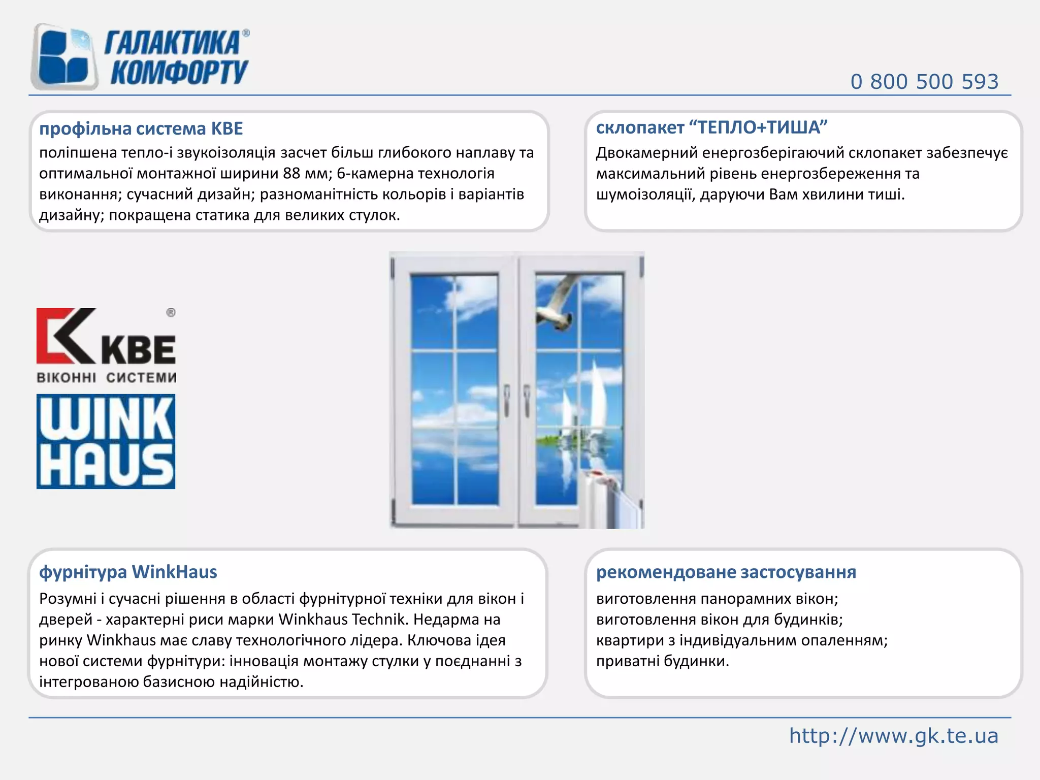 0 800 500593склопакет “ТЕПЛО+ТИША”профільна система KBEполіпшена тепло-і звукоізоляція засчет більш глибокого наплаву та оптимальної монтажної ширини 88 мм; 6-камерна технологія виконання; сучасний дизайн; разноманітністькольорів і варіантів дизайну; покращена статика для великих стулок.Двокамерний енергозберігаючий склопакет забезпечує максимальний рівень енергозбереження та шумоізоляції, даруючи Вам хвилини тиші.фурнітура WinkHausрекомендоване застосуваннявиготовленняпанорамнихвікон;виготовленнявікон для будинків;квартири з індивідуальнимопаленням;приватнібудинки.Розумні і сучасні рішення в області фурнітурної техніки для вікон і дверей - характерні риси марки WinkhausTechnik. Недарма на ринку Winkhausмає славу технологічного лідера. Ключова ідея нової системи фурнітури: інновація монтажу стулки у поєднанні з інтегрованою базисною надійністю.http://www.gk.te.ua