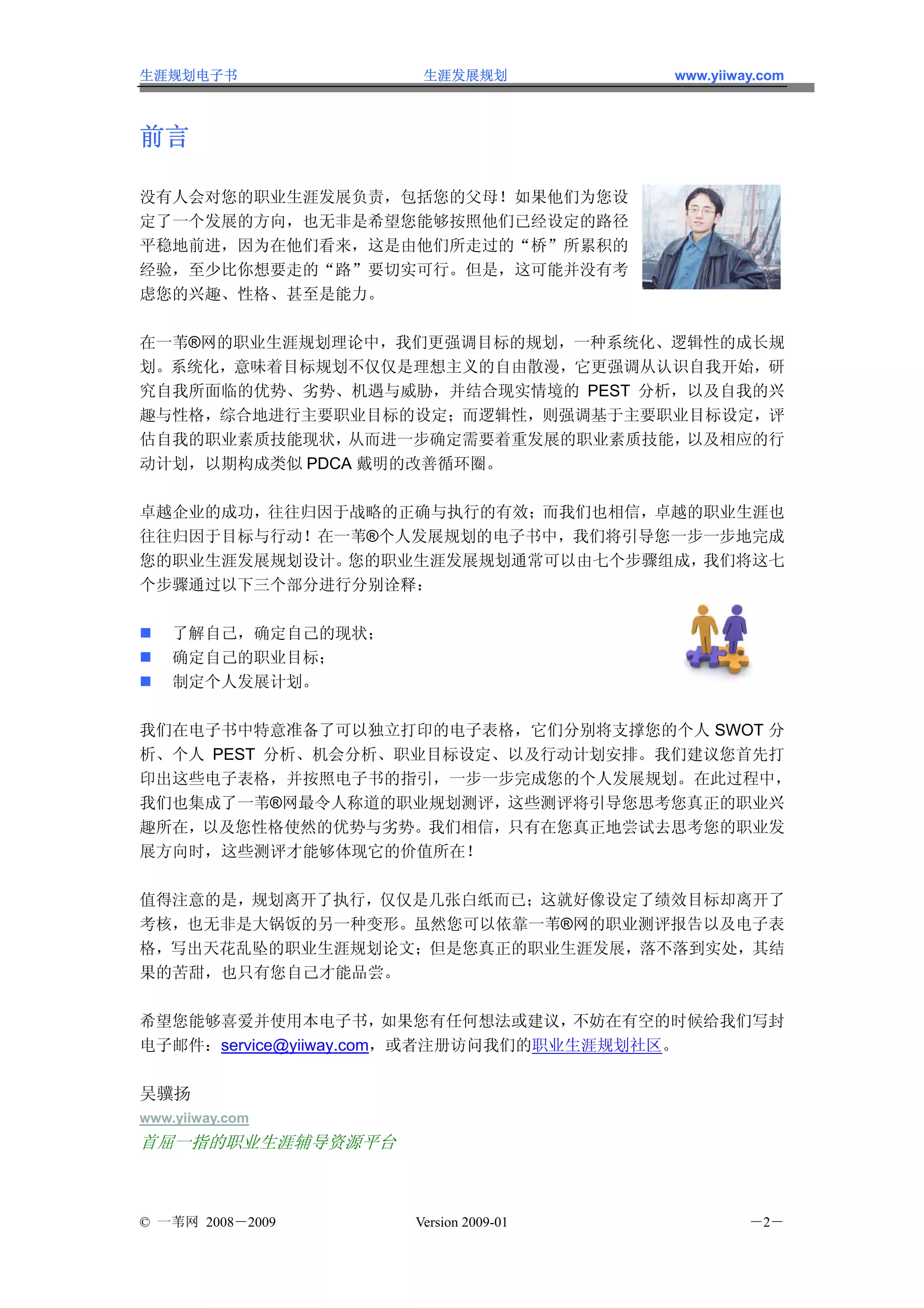 一苇网致力于帮助个人进行职业生涯规划,通过系统化和逻辑性的目标设定,提供定制化的发展解决方案。文档介绍了进行个人发展规划的七个步骤,包括自我分析、职业目标设定和制定行动计划,并强调了SWOT和PEST分析的重要性。成功的职业生涯依赖于积极的规划与执行,个人需要掌握自己的发展方向与主动权。